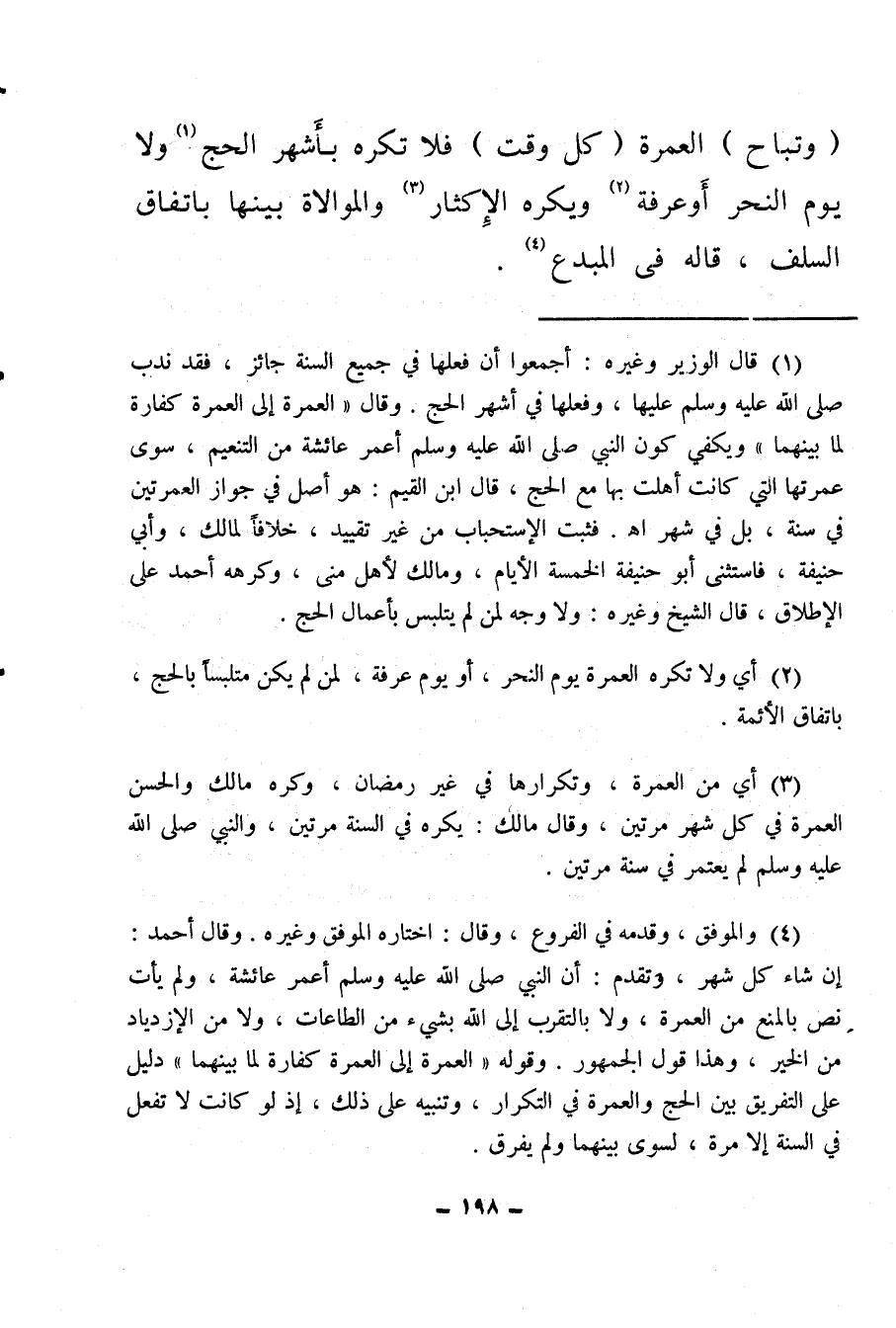 (¬4) والموفق وقدمه في الفروع، وقال: اختاره الموفق وغيره، وقال أحمد: إن شاء كل شهر وتقدم أن النبي صلى الله عليه وسلم أعمر عائشة، ولم يأت نص بالمنع من العمرة ولا بالتقرب إلى الله بشيء من الطاعات، ولا من الازدياد من الخير، وهذا قول الجمهور، وقوله: «العمرة إلى العمرة كفارة لما بينهما» دليل على التفريق بين الحج والعمرة في التكرار، وتنبيه على ذلك إذ لو كانت لا تفعل في السنة إلا مرة، لسوى بينهما ولم يفرق.