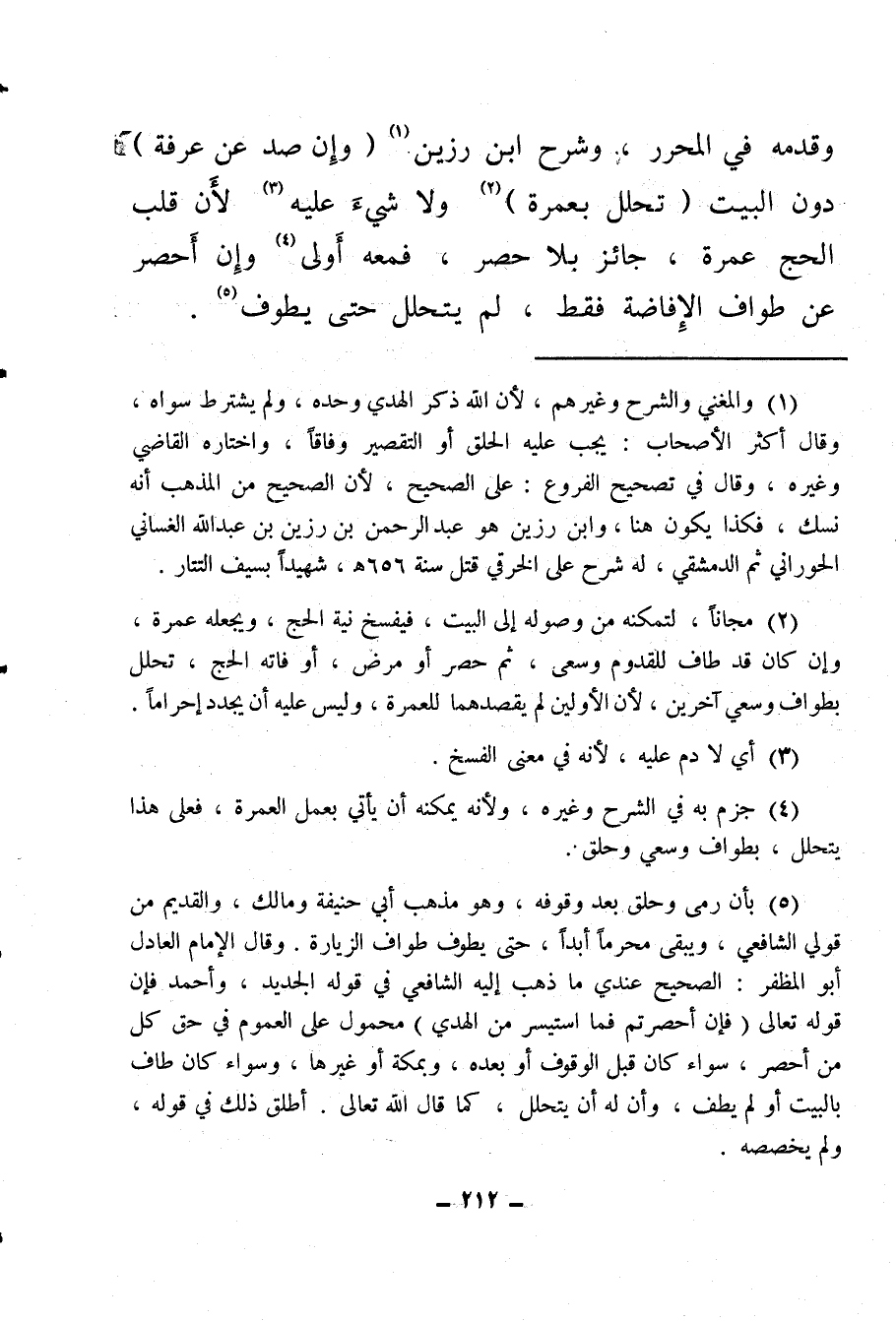 (¬1) والمغني والشرح وغيرهم، لأن الله ذكر الهدي وحده، ولم يشترط سواه، وقال أكثر الأصحاب، يجب عليه الحلق أو التقصير وفاقا، واختاره القاضي وغيره، وقال في تصحيح الفروع: على الصحيح، لأن الصحيح من المذهب أنه نسك فكذا يكون هنا، وابن رزين هو عبد الرحمن بن رزين بن عبد الله الغساني الحوراني ثم الدمشقي، له شرح على الخرقي قتل سنة 656 هـ شهيدا بسيف التتار.