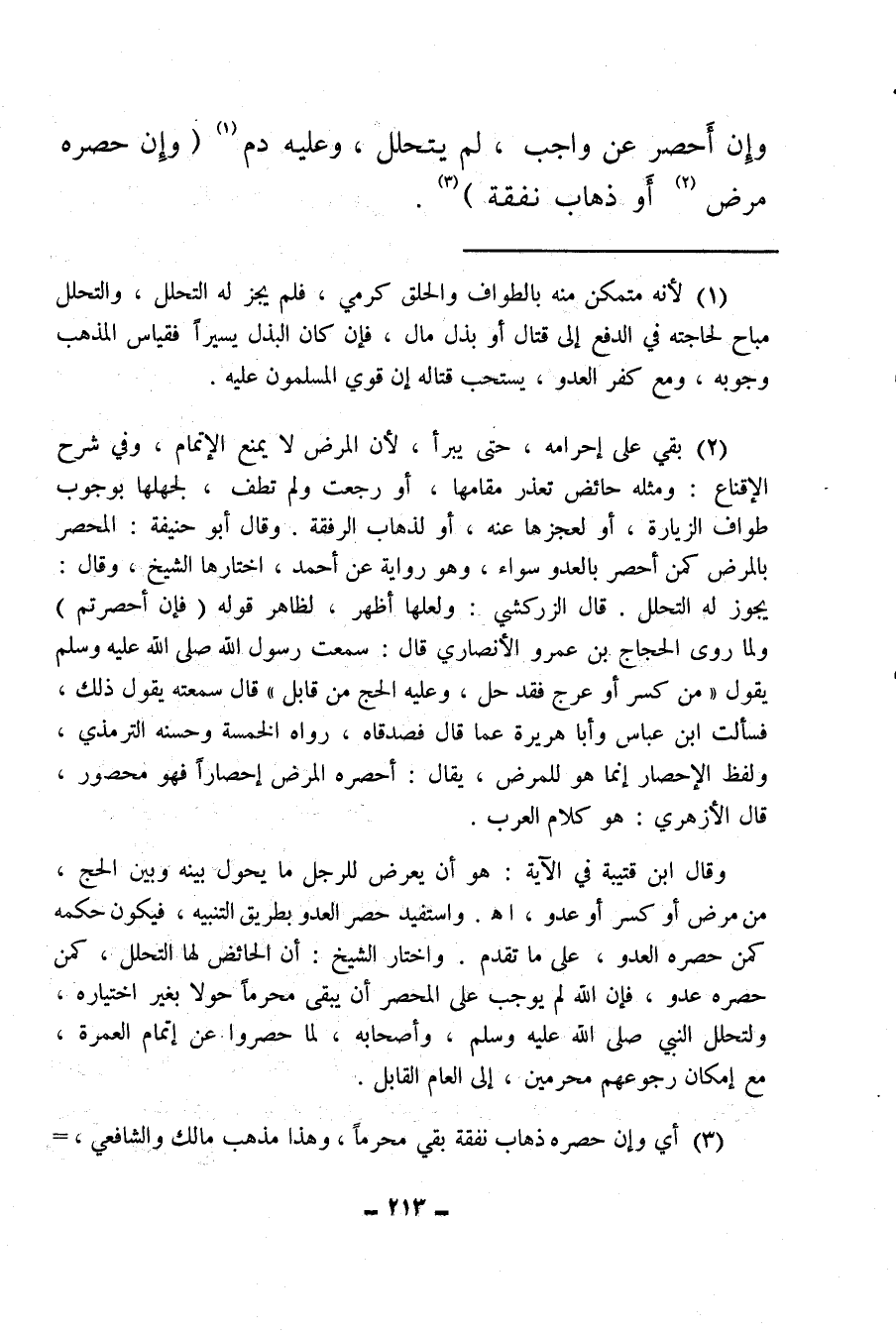 وقال ابن قتيبة في الآية: هو أن يعرض للرجل ما يحول بينه وبين الحج، من مرض أو كسر أو عدو، اهـ واستفيد حصر العدو بطريق التنبيه، فيكون حكمه كمن حصره العدو، على ما تقدم، واختار الشيخ: أن الحائض لها التحلل، كمن حصره عدو، فإن الله لم يوجب على المحصر أن يبقى محرمًا حولاً بغير اختياره ولتحلل النبي صلى الله عليه وسلم وأصحابه لما حصروا عن إتمام العمرة، مع إمكان رجوعهم محرمين، إلى العام القابل.