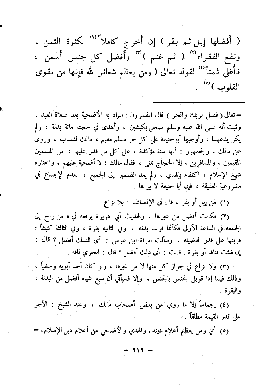 تعالى {فَصَلِّ لِرَبِّكَ وَانْحَرْ} قال المفسرون: المراد به الأضحية بعد صلاة العيد، وثبت أنه صلى الله عليه وسلم ضحى بكبشين، وأهدى في حجته مائة بدنة، ولم يكن يدعهما وأوجبها أبو حنيفة على كل حر مسلم مقيم، مالك لنصاب، وروي عن مالك، والجمهور: أنها سنة مؤكدة، على كل من قدر عليها، من المسلمين المقيمين والمسافرين إلا الحجاج بمنى، فقال مالك: لا أضحية عليهم، واختاره شيخ الإسلام، اكتفاء بالهدي، ولم يعد الضمير إلى الجميع، لعدم الإجماع في مشروعية العقيقة، فإن أبا حنيفة لا يراها.