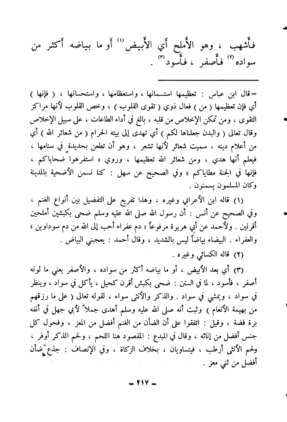 (¬3) قاله ابن الأعرابي وغيره، وهذا تفريع على التفضيل بين أنواع الغنم، وفي الصحيح عن أنس: أن رسول الله صلى الله عليه وسلم ضحى بكبشين أملحين أقرنين، ولأحمد عن أبي هريرة مرفوعًا «دم عفراء أحب إلى الله من دم سوادين» والعفراء البيضاء بياضًا ليس بالشديد وقال أحمد: يعجبني البياض.