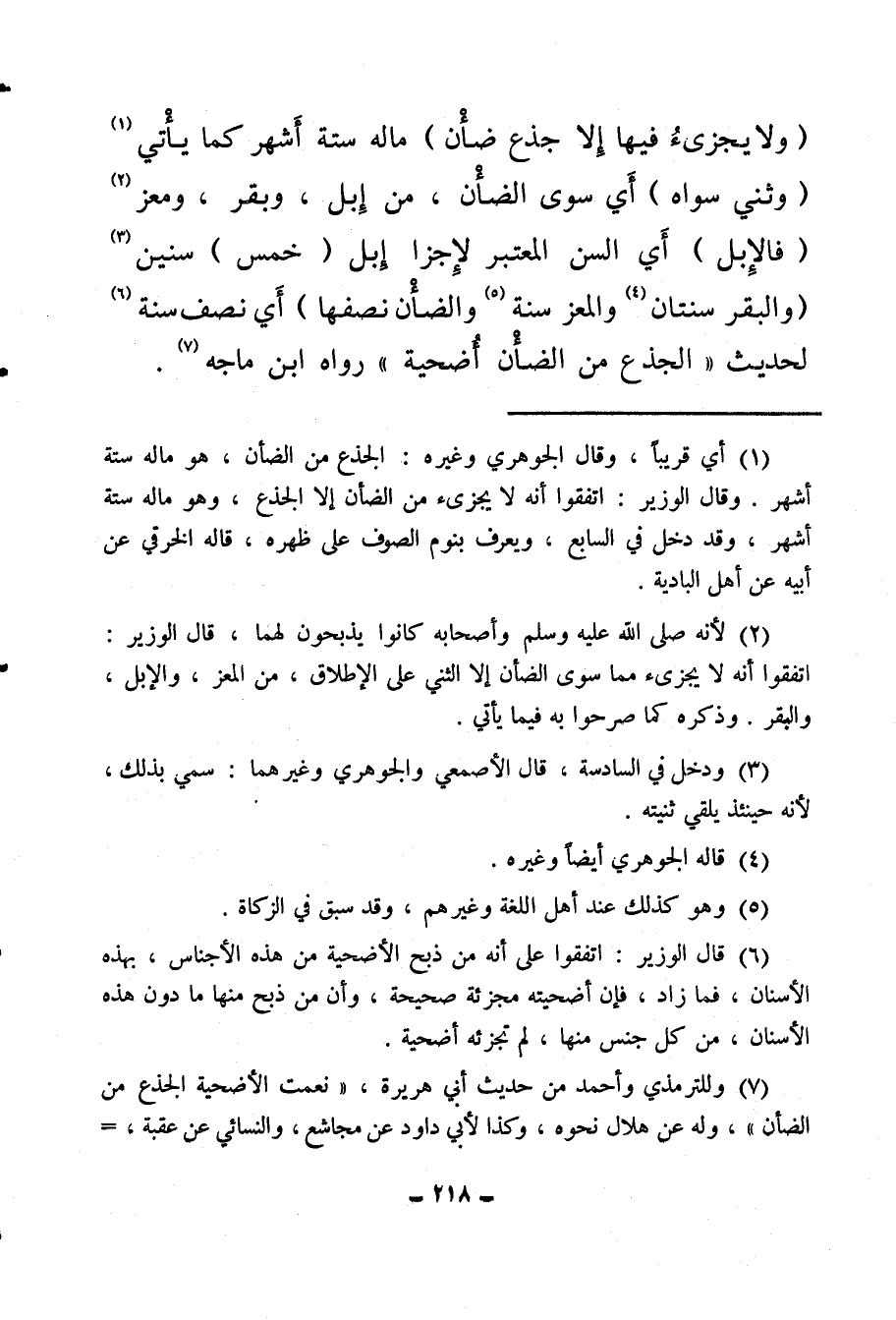 (¬6) قال الوزير: اتفقوا على أنه من ذبح الأضحية من هذه الأجناس، بهذه الأسنان، فما زاد فإن أضحيته مجزئة صحيحة، وأن من ذبح منها ما دون هذه الأسنان، من كل جنس منها، لم تجزئه أضحية.