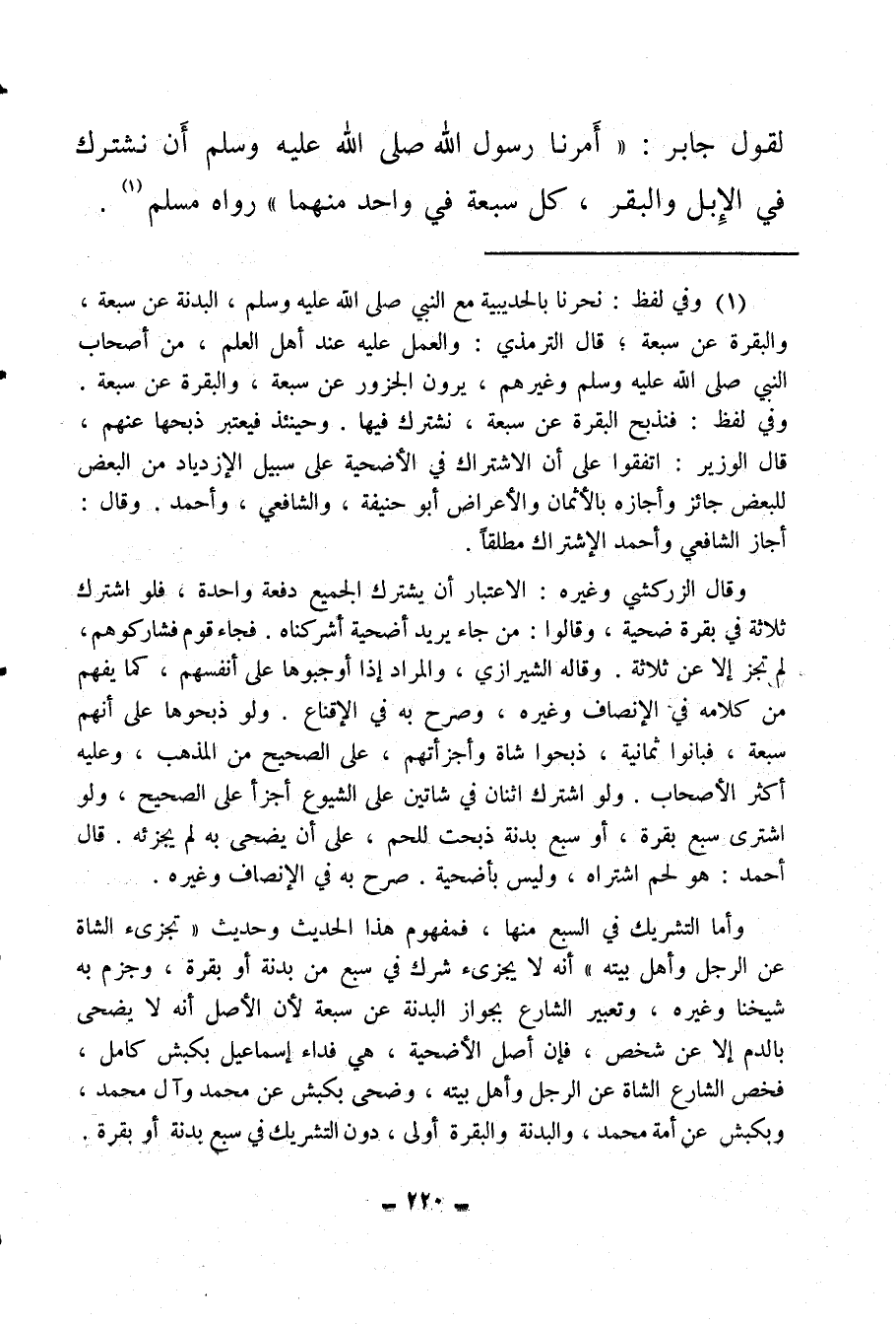 (¬1) وفي لفظ: نحرنا بالحديبية مع النبي صلى الله عليه وسلم البدنة عن سبعة، والبقرة عن سبعة، قال الترمذي: والعمل عليه عند أهل العلم، من أصحاب النبي صلى الله عليه وسلم وغيرهم، يرون الجزور عن سبعة، والبقرة عن سبعة، وفي لفظ: فنذبح البقرة عن سبعة، نشترك فيها، وحينئذ فيعتبر ذبحها عنهم، قال الوزير: اتفقوا على أن الاشتراك في الأضحية على سبيل الازدياد من البعض للبعض جائز وأجازه بالأثمان والأعراض أبو حنيفة، والشافعي وأحمد، وقال: أجاز الشافعي وأحمد الاشتراك مطلقًا.