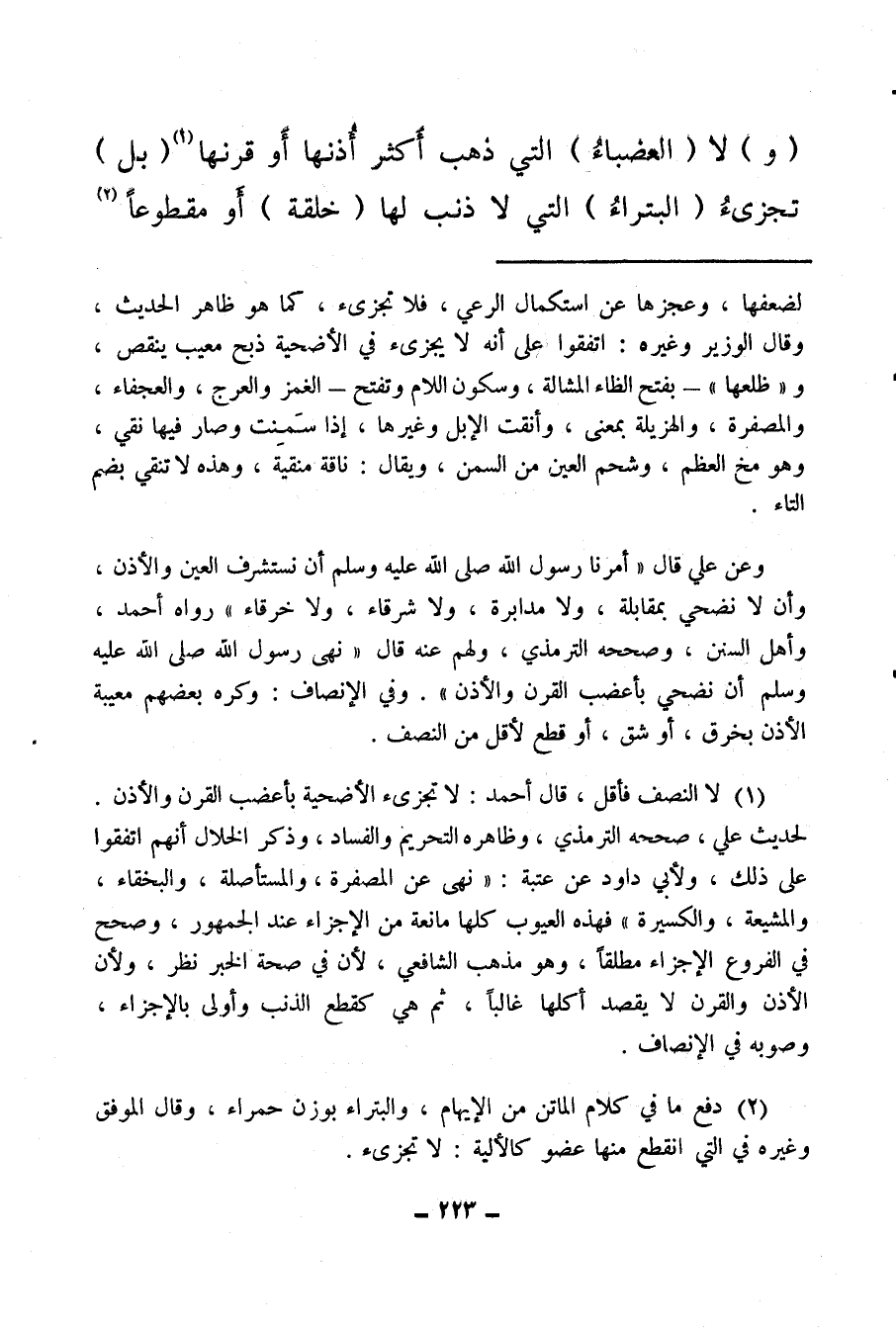 (¬1) لا النصف فأقل، قال أحمد: لا تجزئ الأضحية بأعضب القرن والأذن، لحديث علي، صححه الترمذي، وظاهره التحريم والفساد، وذكر الخلال أنهم اتفقوا على ذلك، ولأبي داود عن عتبة «نهي عن المصفرة والمستأصلة والبخقاء، والمشيعة والكسيرة» فهذه العيوب كلها مانعة من الإجزاء عند الجمهور، وصحح في الفروع الإجزاء مطلقًا، وهو مذهب الشافعي، لأن في صحة الخبر نظر، ولأن الأذن والقرن لا يقصد أكلها غالبا، ثم هي كقطع الذنب وأولى بالإجزاء، وصوبه في الإنصاف.