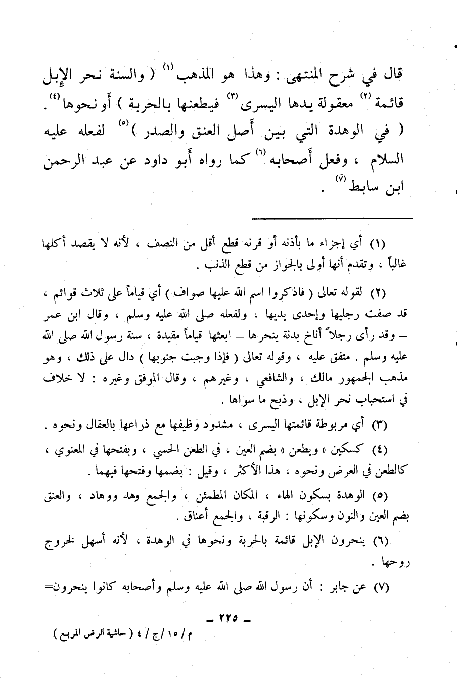 (¬6) ينحرون الإبل قائمة بالحربة ونحوها في الوهدة، لأنه أسهل لخروج روحها.