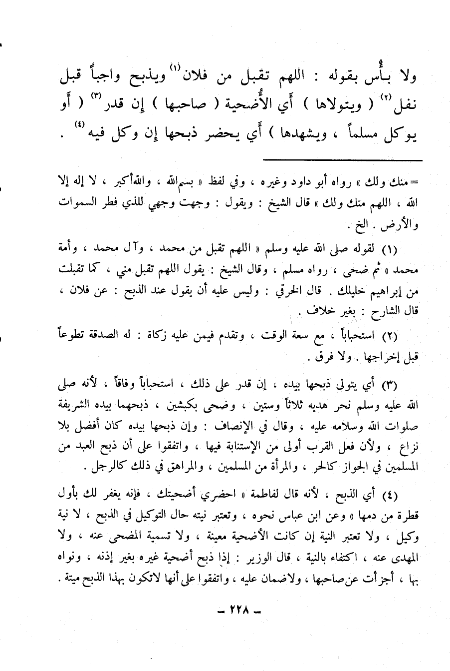 (¬4) أي الذبح، لأنه قال لفاطمة «احضري أضحيتك فإنه يغفر لك بأول قطرة من دمها» وعن ابن عباس نحوه، وتعتبر نيته حال التوكيل في الذبح، لا نية وكيل، ولا تعتبر النية إن كانت الأضحية معينة، ولا تسمية المضحى عنه، ولا المهدي عنه، اكتفاء بالنية، قال الوزير: إذا ذبح أضحية غيره بغير إذنه، ونواه بها، أجزأت عن صاحبها، ولا ضمان عليه واتفقوا على أنها لا تكون بهذا الذبح ميتة.