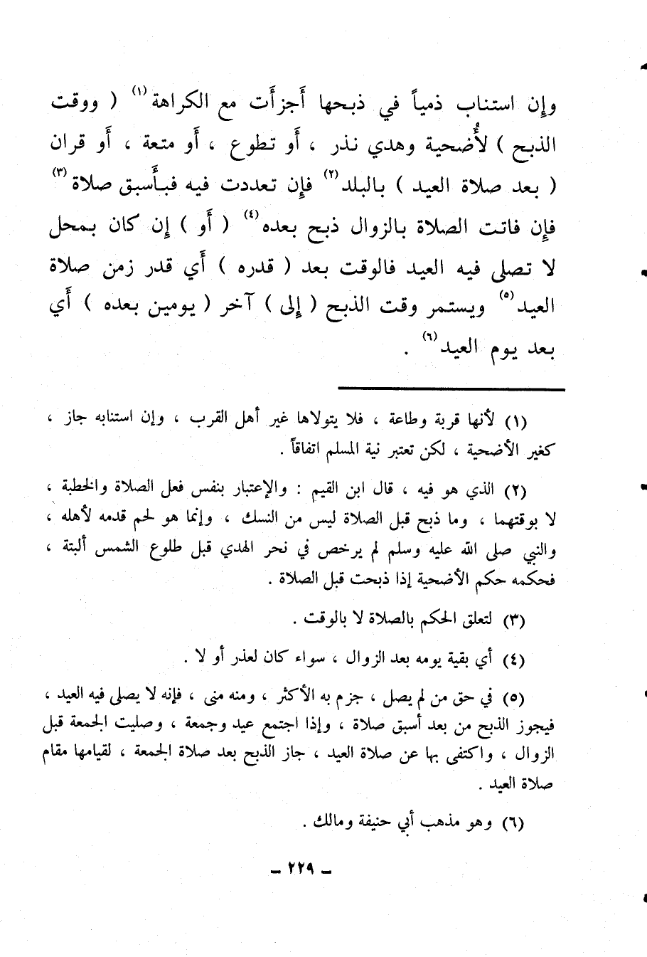(¬5) في حق من لم يصل، جزم به الأكثر، ومنه منى، فإنه لا يصلى فيه العيد، فيجوز الذبح من بعد أسبق صلاة، وإذا اجتمع عيد وجمعة، وصليت الجمعة قبل الزوال، واكتفى بها عن صلاة العيد، جاز الذبح بعد صلاة الجمعة، لقيامها مقام صلاة العيد.