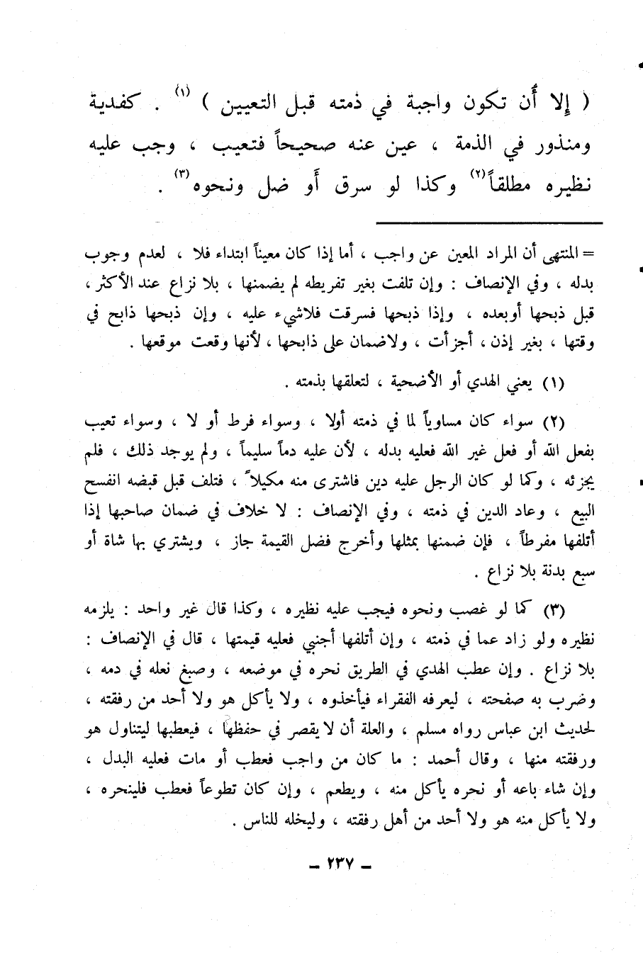 (¬3) كما لو غصب ونحوه فيجب عليه نظيره، وكذا قال غير واحد: يلزمه نظيره ولو زاد عما في ذمته، وإن أتلفها أجنبي فعليه قيمتها، قال في الإنصاف: بلا نزاع، وإن عطب الهدي في الطريق نحره في موضعه، وصبغ نعله في دمه، وضرب به صفحته، ليعرفه الفقراء فيأخذوه، ولا يأكل هو ولا أحد من رفقته، لحديث ابن عباس رواه مسلم، والعلة أن لا يقصر في حفظها، فيعطبها ليتناول هو ورفقته منها، وقال أحمد: ما كان من واجب فعطب أو مات فعليه البدل، وإن شاء باعه أو نحره يأكل منه، ويطعم، وإن كان تطوعًا فعطب فلينحره ولا يأكل منه هو ولا أحد من أهل رفقته، وليخله للناس.
