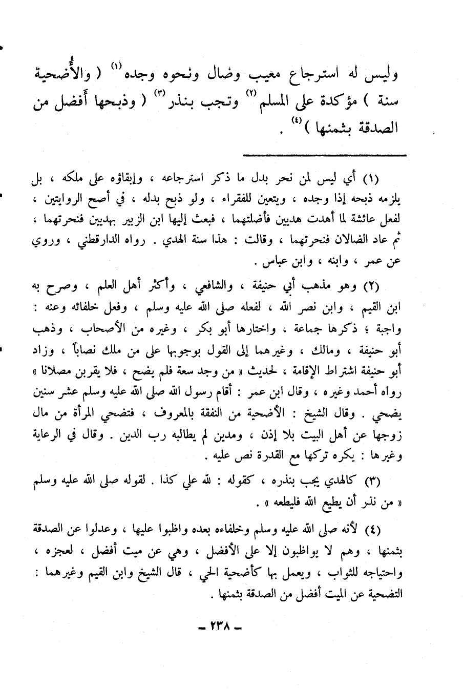 (¬2) وهو مذهب أبي حنيفة، والشافعي، وأكثر أهل العلم، وصرح به ابن القيم، وابن نصر الله، لفعله صلى الله عليه وسلم وفعل خلفائه وعنه: واجبة ذكرها جماعة، واختارها أبو بكر، وغيره من الأصحاب، وذهب أبو حنيفة، ومالك، وغيرهما إلى القول بوجوبها على من ملك نصابا، وزاد أبو حنيفة اشتراط الإقامة، لحديث «من وجد سعة فلم يضح، فلا يقربن مصلانا» رواه أحمد وغيره، وقال ابن عمر: أقام رسول الله صلى الله عليه وسلم عشر سنين يضحي وقال الشيخ: الأضحية من النفقة بالمعروف، فتضحي المرأة من مال زوجها عن أهل البيت بلا إذن ومدين لم يطالبه رب الدين، وقال في الرعاية وغيرها: يكره تركها مع القدرة نص عليه.