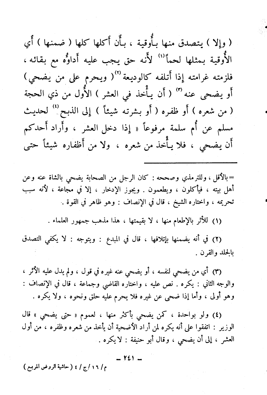 (وإلا) يتصدق منها بأوقية بأن أكلها كلها (ضمنها) أي الأوقية بمثلها لحمًا (¬1) لأنه حق يجب عليه أداؤه مع بقائه، فلزمته غرامته إذا أتلفه كالوديعة (¬2) (ويحرم على من يضحي) أو يضحى عنه (¬3) (أن يأخذ في العشر) الأول من ذي الحجة (من شعره) أوظفره (أو بشرته شيئا) إلى الذبح لحديث مسلم عن أم سلمة مرفوعا «إذا دخل العشر، وأراد أحدكم أن يضحي فلا يأخذ من شعره، ولا من أظفاره شيئًا حتى