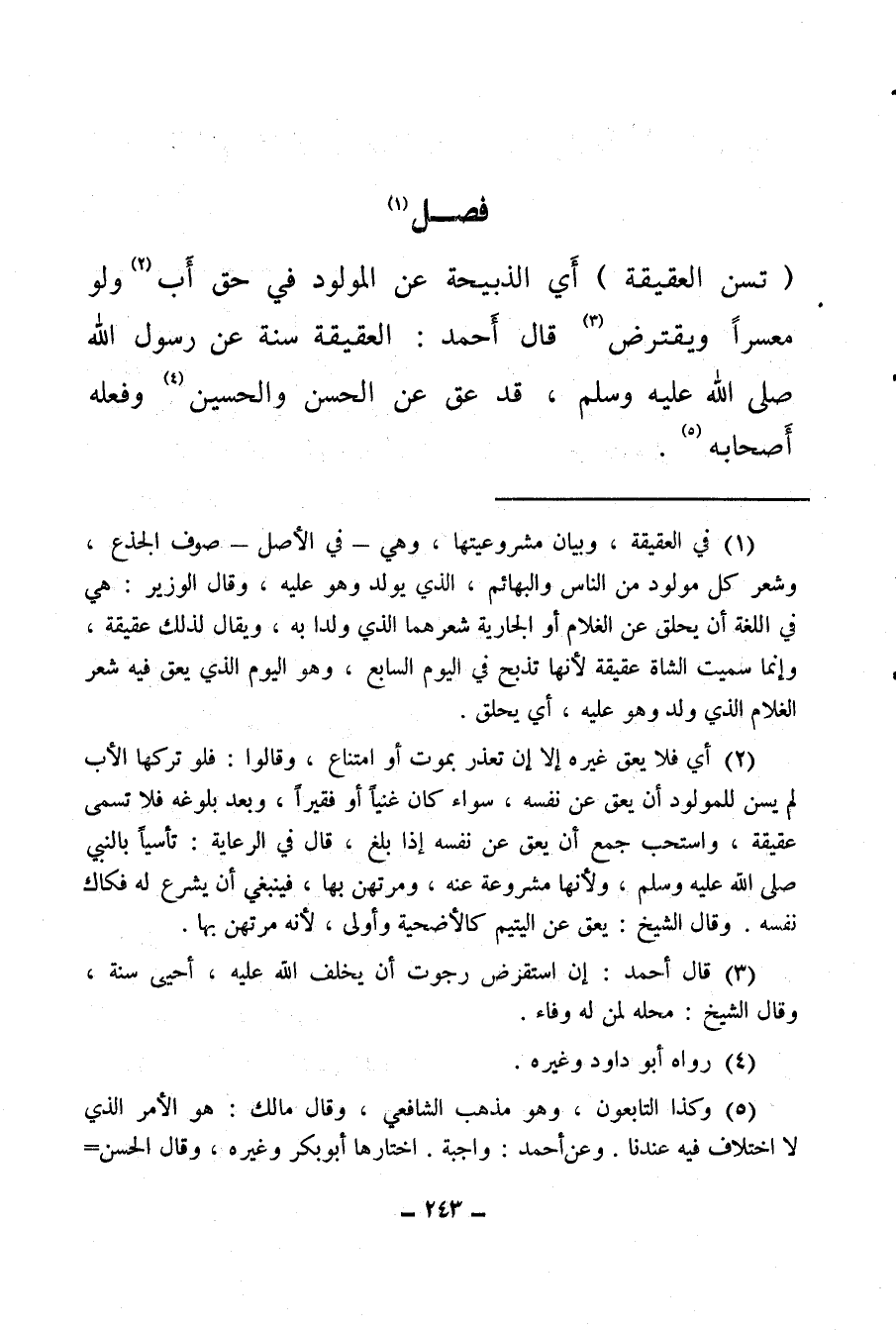(تسن العقيقة) أي الذبيحة عن المولود في حق أب (¬2) ولو معسرًا ويقترض (¬3) قال أحمد: العقيقة سنة عن رسول الله صلى الله عليه وسلم قد عقَّ عن الحسن والحسين (¬4) وفعله أصحابه (¬5) .