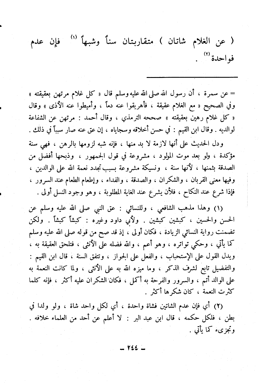 (¬1) وهذا مذهب الشافعي، وللنسائي: عق النبي صلى الله عليه وسلم عن الحسن والحسين، كبشين كبشين، ولأبي داود وغيره، كبشًا كبشًا، ولكن تضمنت رواية النسائي الزيادة فكان أولى، إذ قد صح من قوله صلى الله عليه وسلم كما يأتي، وحكي تواتره، وهو أعم، والله فضله على الأنثى، فتلحق العقيقة به، ويدل القول على الاستحباب، والفعل على الجواز، وتتفق السنة قال ابن القيم: والتفضيل تابع لشرف الذكر، وما ميزه الله به على الأنثى، ولما كانت النعمة به على الوالد أتم، والسرور والفرحة به أكمل، فكان الشكران عليه أكثر، فإنه كلما كثرت النعمة كان شكرها أكثر.