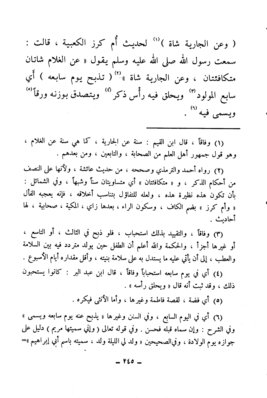 (¬3) وفاقا، والتقييد بذلك استحباب، فلو ذبح في الثالث، أو التاسع، أو غيرها أجزأ، والحكمة والله أعلم أن الطفل حين يولد متردد فيه بين السلامة والعطب، إلى أن يأتي عليه ما يستدل به على سلامة بنيته وأقل مقداره أيام الأسبوع.