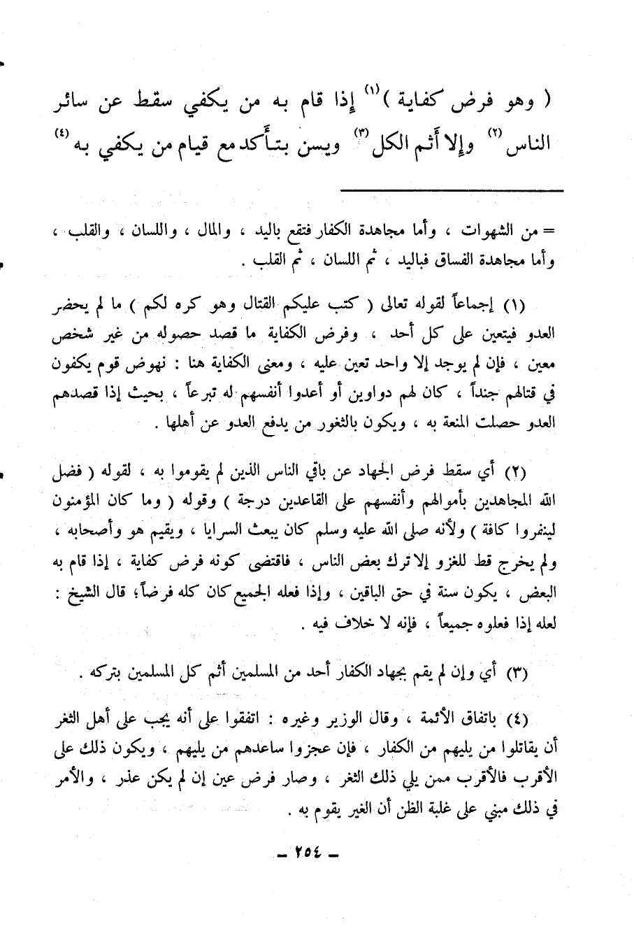 (¬1) إجماعا لقوله تعالى: {كُتِبَ عَلَيْكُمُ الْقِتَالُ وَهُوَ كُرْهٌ لَكُمْ} مالم يحضر العدو فيتعين على كل أحد، وفرض الكفاية ما قصد حصوله من غير شخص معين، فإن لم يوجد إلا واحد تعين عليه، ومعنى الكفاية هنا: نهوض قوم يكفون في قتالهم جندا، كان لهم دواوين أو أعدوا أنفسهم له تبرعًا، بحيث إذا قصدهم العدو حصلت المنعة به، ويكون بالثغور من يدفع العدو عن أهلها.