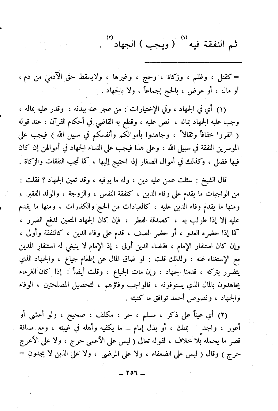 (¬1) أي في الجهاد، وفي الاختيارات، من عجز عنه ببدنه، وقدر عليه بماله، وجب عليه الجهاد بماله، نص عليه وقطع به القاضي في أحكام القرآن، عند قوله: {انْفِرُوا خِفَافًا وَثِقَالاً وَجَاهِدُوا بِأَمْوَالِكُمْ وَأَنْفُسِكُمْ فِي سَبِيلِ اللهِ} فيجب على الموسرين النفقة في سبيل الله، وعلى هذا فيجب على النساء الجهاد في أموالهن إن كان فيها فضل، وكذلك في أموال الصغار إذا احتيج إليها، كما تجب النفقات والزكاة.