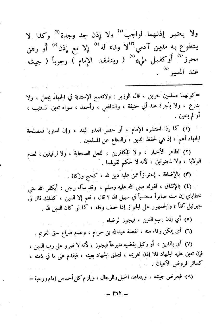 (¬7) أي بالدين، أو وكيل يقضيه متبرعا فيجوز، لأنه لا ضرر على رب الدين، فإن تعين عليه الجهاد فلا إذن لغريمه، لتعلق الجهاد بعينه، فيقدم على ما في ذمته، كسائر فروض الأعيان.