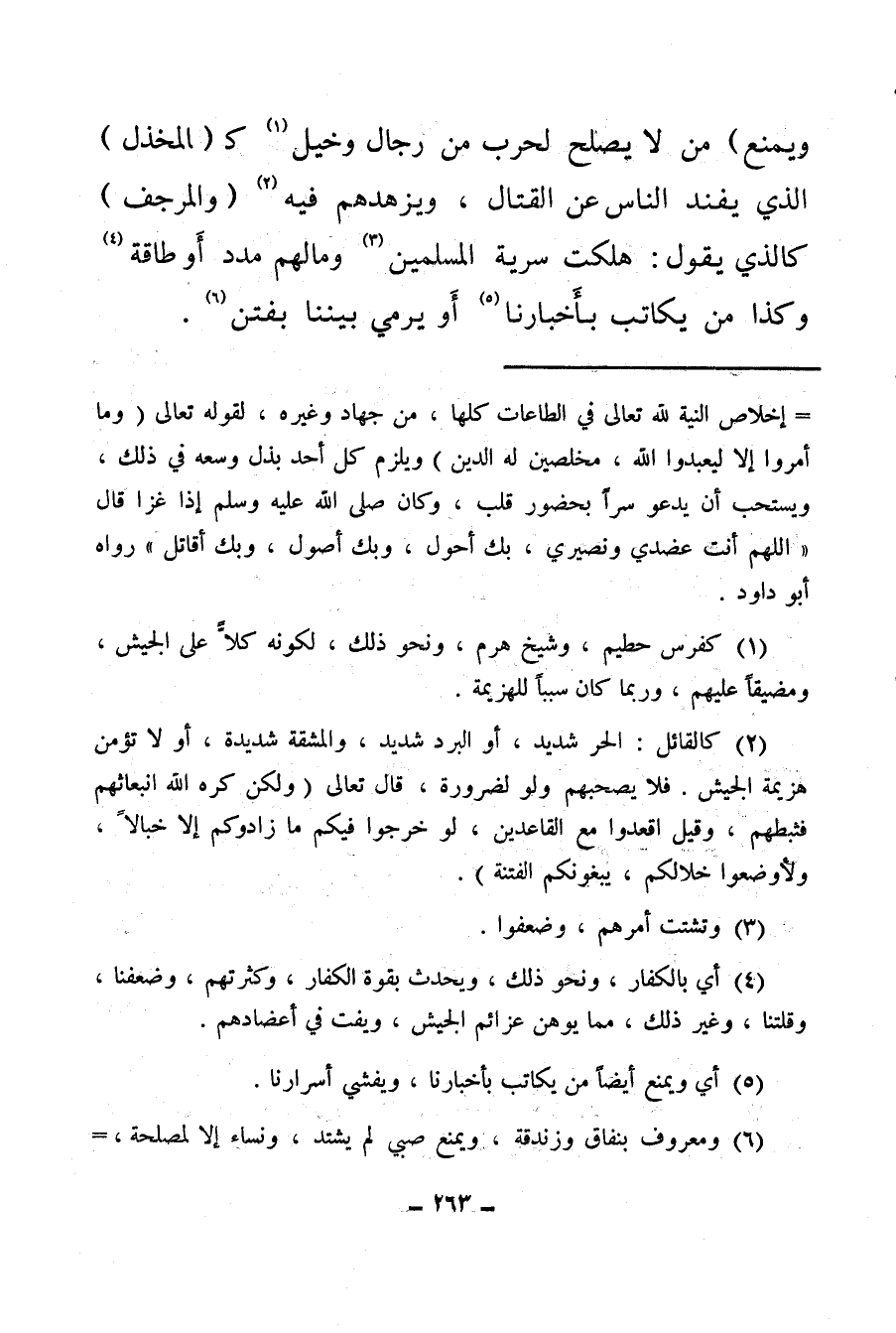 (¬2) كالقائل: الحر شديد، أو البرد شديد، والمشقة شديدة، أو لا تؤمن هزيمة الجيش، فلا يصحبهم ولو لضرورة، قال تعالى: {وَلَكِنْ كَرِهَ اللهُ انْبِعَاثَهُمْ فَثَبَّطَهُمْ وَقِيلَ اقْعُدُوا مَعَ الْقَاعِدِينَ * لَوْ خَرَجُوا فِيكُمْ مَا زَادُوكُمْ إِلا خَبَالاً وَلأَوْضَعُوا خِلالَكُمْ يَبْغُونَكُمُ الْفِتْنَةَ} .