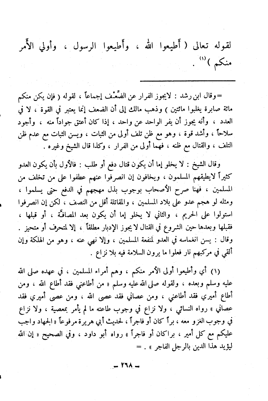(¬1) أي وأطيعوا أولي الأمر منكم، وهم أمراء المسلمين، في عهده صلى الله عليه وسلم وبعده، ولقوله صلى الله عليه وسلم «من أطاعني فقد أطاع الله، ومن أطاع أميري فقد أطاعني، ومن عصاني فقد عصى الله، ومن عصى أميري فقد عصاني» رواه النسائي، ولا نزاع في وجوب طاعته ما لم يأمر بمعصية، ولا نزاع في وجوب الغزو معه، برًّا كان أو فاجرًا، لحديث أبي هريرة مرفوعًا «الجهاد واجب عليكم مع كل أمير، برًّا كان أو فاجرًا» رواه أبو داود، وفي الصحيح «إن الله ليؤيد هذا الدين بالرجل الفاجر» .