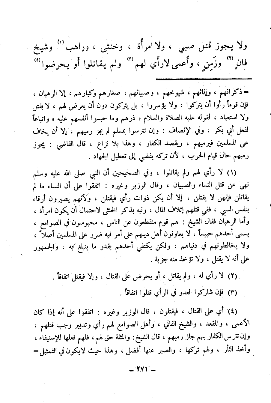 (¬1) لا رأي لهم ولم يقاتلوا، وفي الصحيحين أن النبي صلى الله عليه وسلم نهى عن قتل النساء والصبيان، وقال الوزير وغيره: اتفقوا على أن النساء ما لم يقاتلن فإنهن لا يقتلن، إلا أن يكون ذوات رأي فيقتلن، ولأنهم يصيرون أرقاء بنفس السبي، ففي قتلهم إتلاف المال، ونبه بذكر الخنثى لاحتمال أن يكون امرأة، وأما الرهبان فقال الشيخ: هم قوم منقطعون عن الناس، محبوسون في الصوامع، يسمَّى أحدهم حبيسًا، لا يعاونون أهل دينهم على أمر فيه ضرر على المسلمين أصلا، ولا يخالطونهم في دنياهم، ولكن يكتفي أحدهم بقدر ما يتبلغ به، والجمهور على أنه لا يقتل، ولا تؤخذ منه جزية.