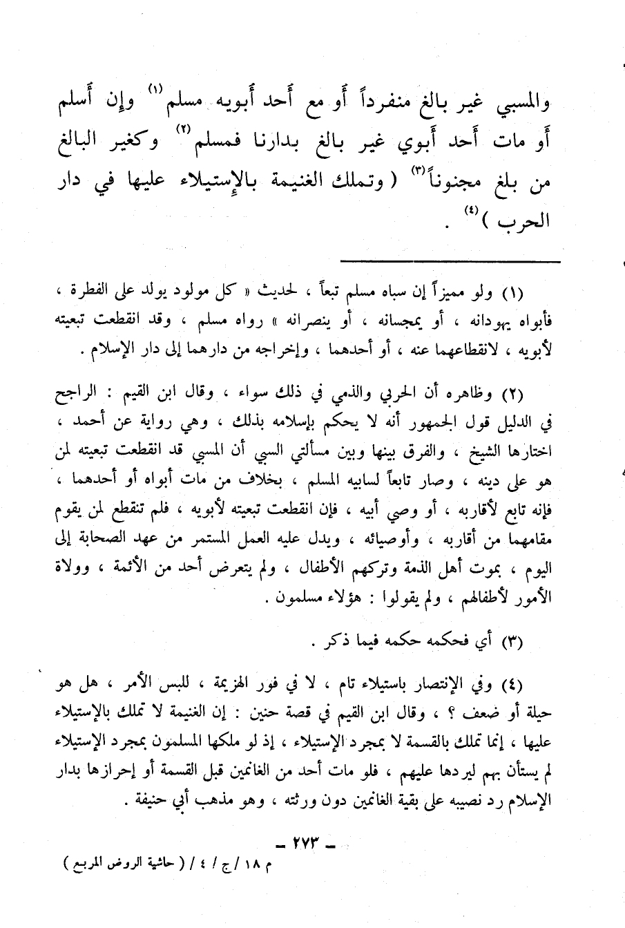 (¬2) وظاهره أن الحربي والذمي في ذلك سواء، وقال ابن القيم: الراجح في الدليل قول الجمهور أنه لا يحكم بإسلامه بذلك، وهي رواية عن أحمد، اختارها الشيخ، والفرق بينهما وبين مسألتي السبي أن المسبي قد انقطعت تبعيته لمن هو على دينه، وصار تابعًا لسابيه المسلم، بخلاف من مات أبواه أو أحدهما، فإنه تابع لأقاربه، أو وصي أبيه، فإن انقطعت تبعيته لأبويه، فلم تنقطع لمن يقوم مقامهما من أقاربه، وأوصيائه، ويدل عليه العمل المستمر من عهد الصحابة إلى اليوم، بموت أهل الذمة وتركهم الأطفال، ولم يتعرض أحد من الأئمة وولاة الأمور لأطفالهم، ولم يقولوا: هؤلاء مسلمون.