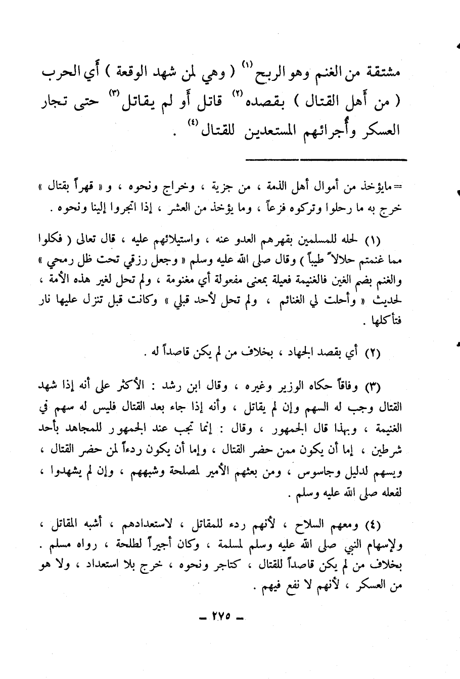 مشتقة من الغنم وهو الربح (¬1) (وهي لمن شهد الوقعة) أي الحرب (من أهل القتال) بقصده (¬2) قاتل أو لم يقاتل (¬3) حتى تجار العسكر وأجرائهم المستعدين للقتال (¬4) .