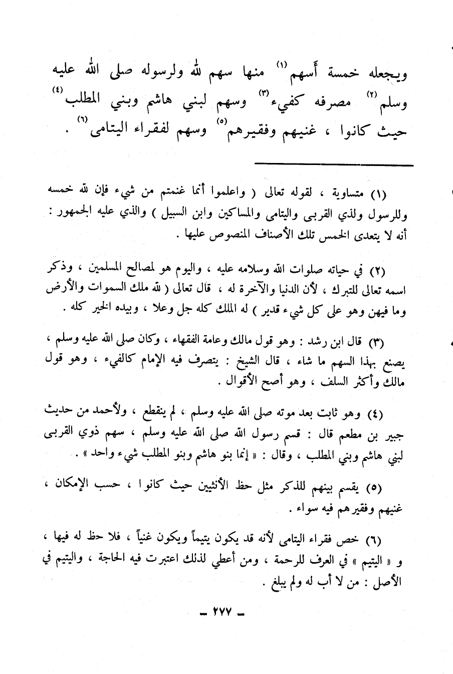 (¬1) متساوية لقوله تعالى: {وَاعْلَمُوا أَنَّمَا غَنِمْتُمْ مِنْ شَيْءٍ فَأَنَّ للهِ خُمُسَهُ وَلِلرَّسُولِ وَلِذِي الْقُرْبَى وَالْيَتَامَى وَالْمَسَاكِينِ وَابْنِ السَّبِيلِ} والذي عليه الجمهور: أنه لا يتعدى الخمس تلك الأصناف المنصوص عليها.