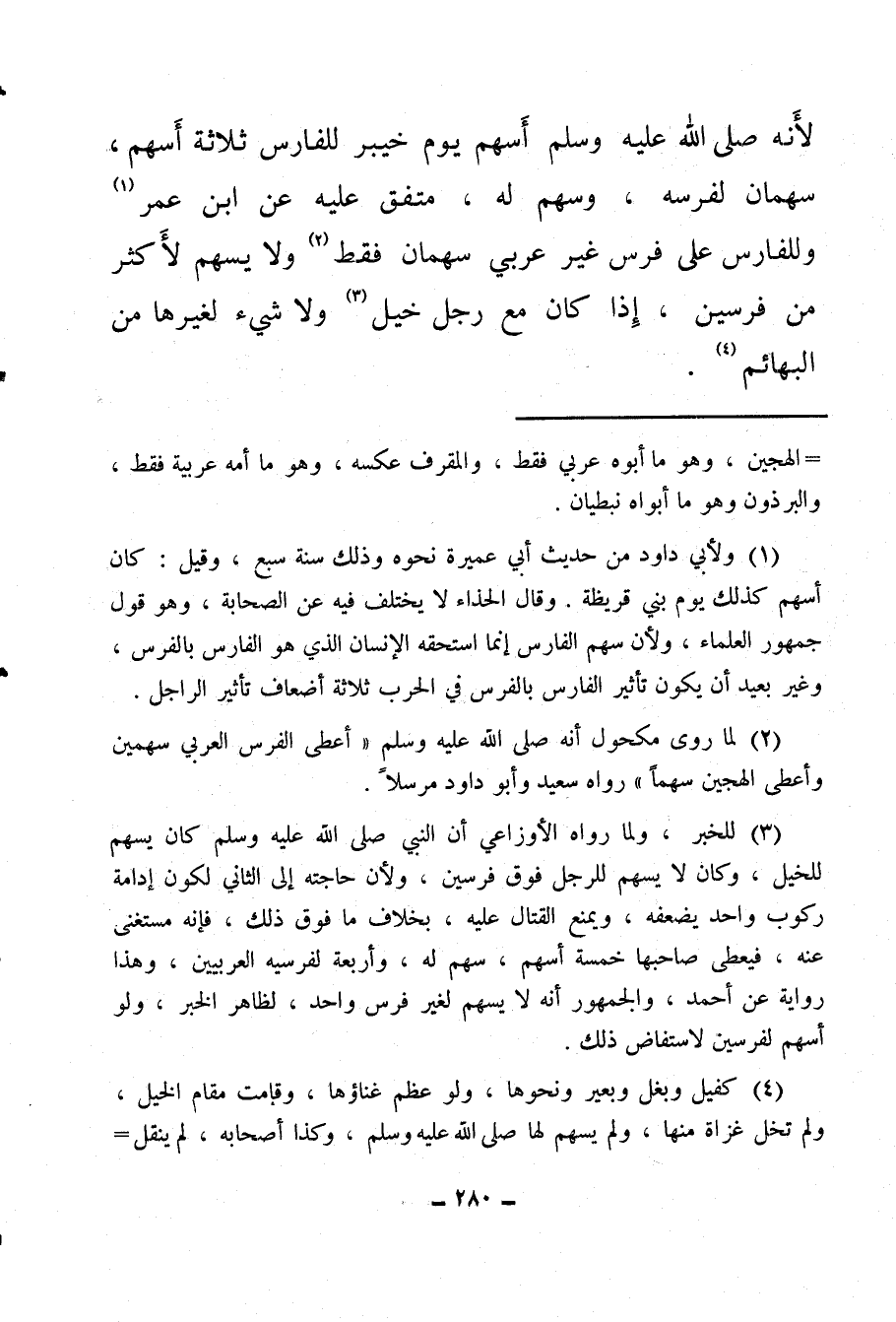 (¬3) للخبر ولما رواه الأوزاعي أن النبي صلى الله عليه وسلم كان يسهم للخيل، وكان لا يسهم للرجل فوق فرسين، ولأن حاجته إلى الثاني لكون إدامة ركوب واحد يضعفه، ويمنع القتال عليه، بخلاف ما فوق ذلك، فإنه مستغنى عنه، فيعطى صاحبها خمسة أسهم، سهم له، وأربعة لفرسيه العربيين، وهذا رواية عن أحمد، والجمهور أنه لا يسهم لغير فرس واحد، لظاهر الخبر، ولو أسهم لفرسين لاستفاض ذلك.