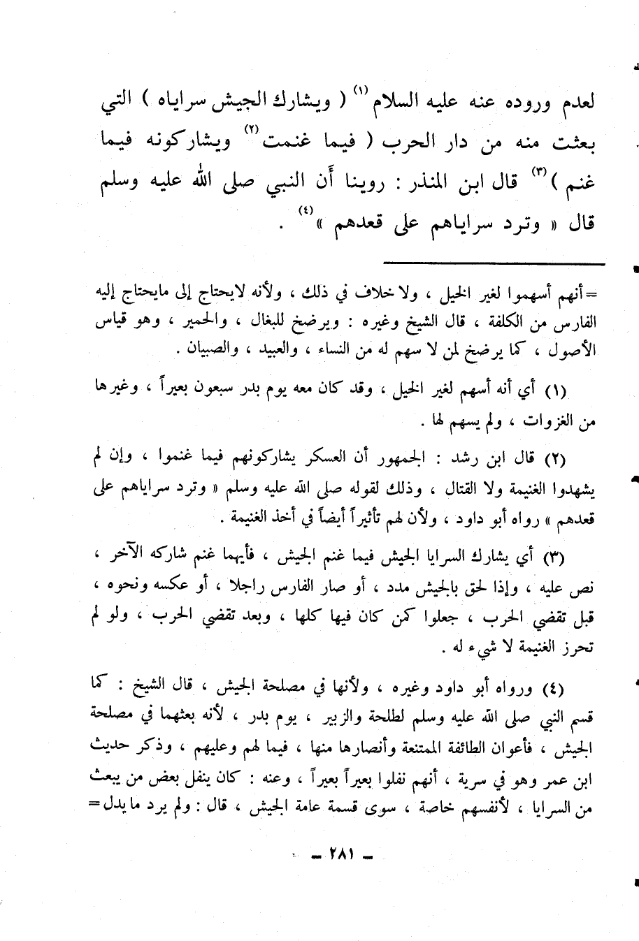 (¬4) ورواه أبو داود وغيره، ولأنها في مصلحة الجيش، قال الشيخ: كما قسم النبي صلى الله عليه وسلم لطلحة والزبير، يوم بدر، لأنه بعثهما في مصلحة الجيش، فأعوان الطائفة الممتنعة وأنصارها منها، فيما لهم وعليهم، وذكر حديث ابن عمر وهو في سرية، وأنهم نفلوا بعيرًا بعيرًا، وعنه: كان ينفل بعض من يبعث من السرايا، لأنفسهم خاصة، سوى قسمة عامة الجيش، قال: ولم يرد ما يدل على الاقتصار على نوع معين، ولا مقدار معين، فيفوض إلى رأي الإمام، وهو قول الجمهور.