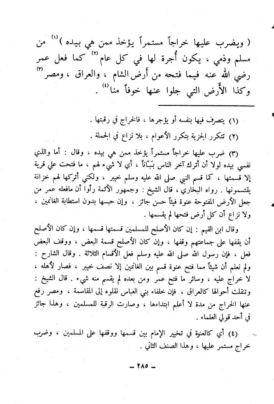 (¬3) ضرب عليها خراجًا مستمرًّا يؤخذ ممن هي بيده، وقال: أما والذي نفسي بيده لولا أن أترك آخر الناس ببَّانا، أي لا شيء لهم، ما فتحت عليَّ قرية إلا قسمتها، كما قسم النبي صلى الله عليه وسلم خيبر، ولكني أتركها لهم خزانة يقتسمونها رواه البخاري، قال الشيخ: وجمهور الأئمة رأوا أن ما فعله عمر بن جعل الأرض مفتوحة عنوة فيئًا حسن جائز، وإن حبسها بدون استطابة الغانمين ولا نزاع أن كل أرض فتحها لم يقسمها.