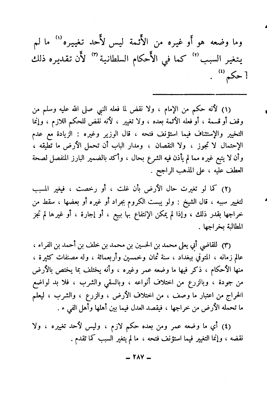 (¬3) للقاضي أبي يعلى محمد بن الحسين بن محمد بن خلف بن أحمد بن الفراء، عالم زمانه، المتوفى ببغداد، سنة ثمان وخمسين وأربعمائة، وله مصنفات كثيرة منها الأحكام، ذكر فيها ما وضعه عمر وغيره، وأنه يختلف بما يختص بالأرض من جودة وبالزرع من اختلاف أنواعه، وبالسقي والشرب فلا بد لواضع الخراج من اعتبار ما وصف، من اختلاف الأرض، والزرع، والشرب، ليعلم ما تحمله الأرض من خراجها، فيقصد العدل فيما بين أهلها وأهل الفيء.