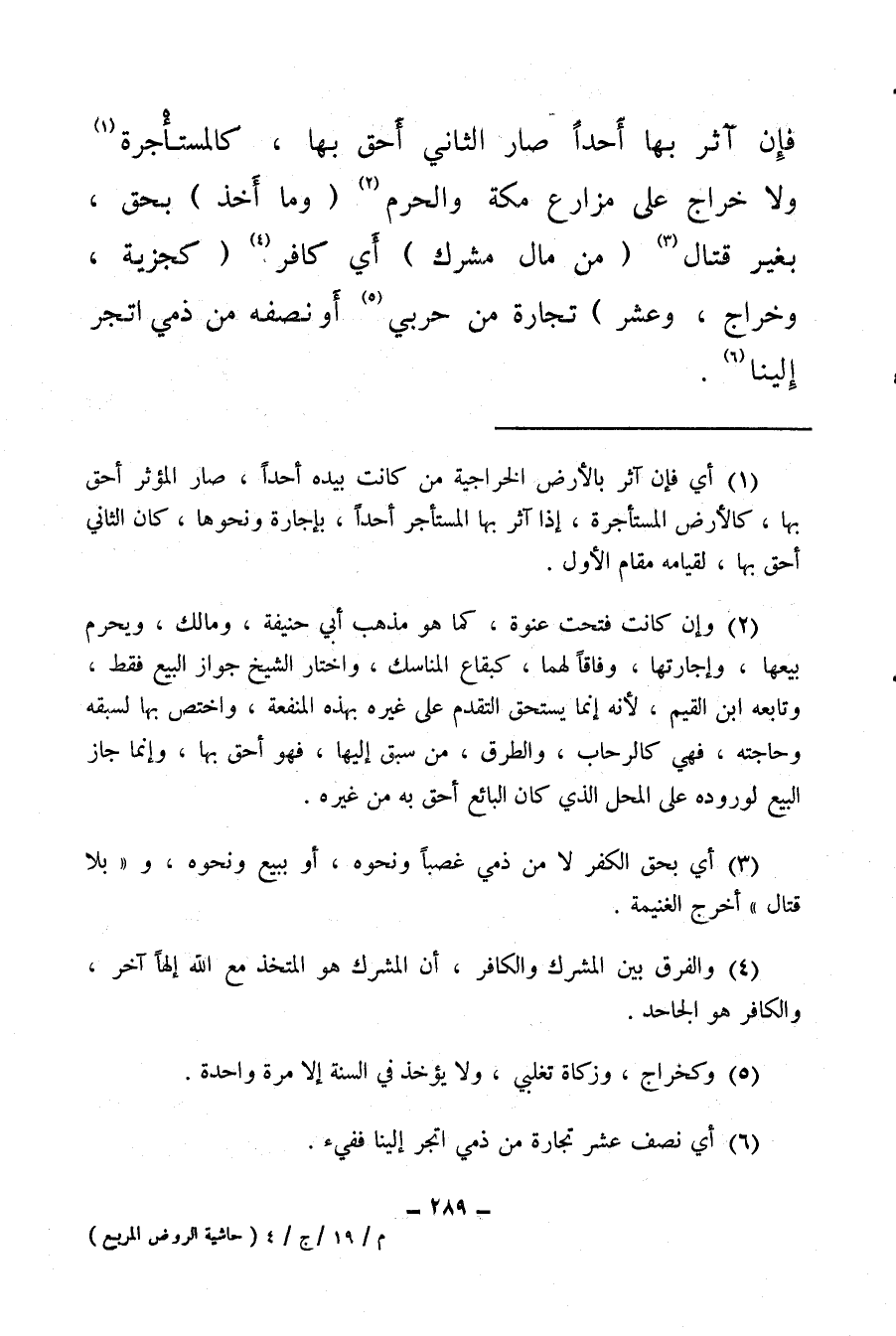 فإن آثر بها أحدًا صار الثاني أحق بها، كالمستأجرة (¬1) ولا خراج على مزارع مكة والحرم (¬2) (وما أخذ) بحق بغير قتال (¬3) (من مال مشرك) أي كافر (¬4) (كجزية وخراج، وعشر) تجارة من حربي (¬5) أو نصفه من ذمي اتجر إلينا (¬6) .