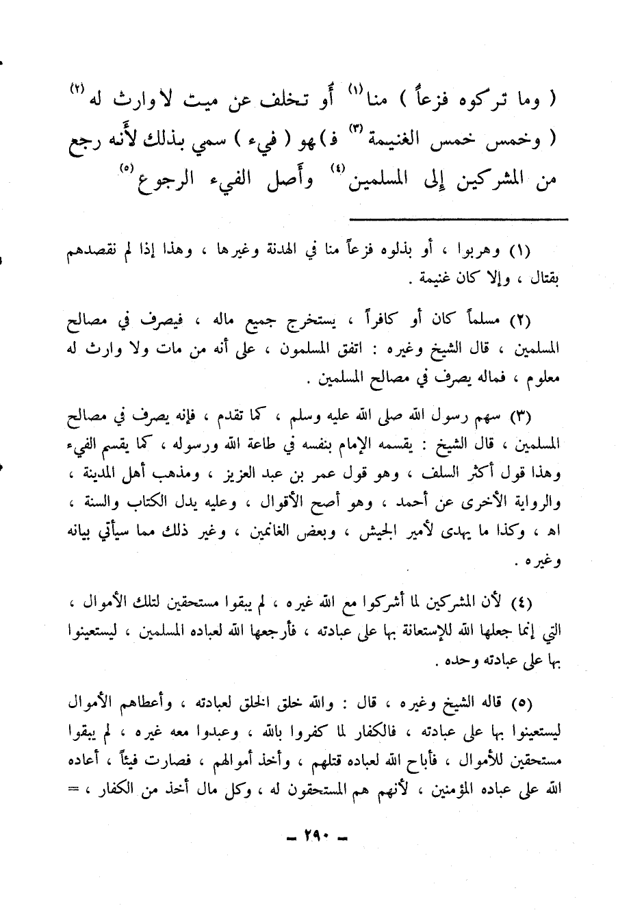 وجمهور العلماء على أن الفيء لا يخمس، كقول مالك وأبي حنيفة، وأحمد، وهو قول السلف قاطبة، وهو الصواب، فإن السنة الثابتة، عن رسول الله صلى الله عليه وسلم وخلفائه، تقتضي أنهم لم يخمسوا فيئًا قط، ومنشأ الخلاف، أنه لما كان لفظ آية الخمس، وآية الفيء واحدًا، اختلف فهم الناس للقرآن، وصوب: أن مال الخمس والفيء سواء.