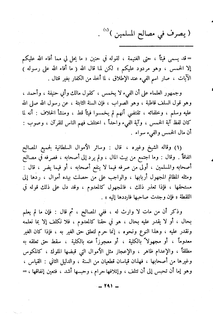 (¬1) وقاله الشيخ وغيره، قال: وسائر الأموال السلطانية لجميع المصالح اتفاقًا، وقال: وما اجتمع من بيت المال، ولم يرد إلى أصحابه، فصرفه في مصالح أصحابه والمسلمين، أولى من صرفه فيما لا ينفع أصحابه، أو فيما يضر قال: ومثله المظالم المجهول أربابها، والواجب على من حصلت بيد أموال، ردها إلى مستحقها، فإذا تعذر ذلك، فالمجهول كالمعدوم، وقد دل على ذلك قوله في اللقطة «فإن وجدت صاحبها فارددها إليه» .
