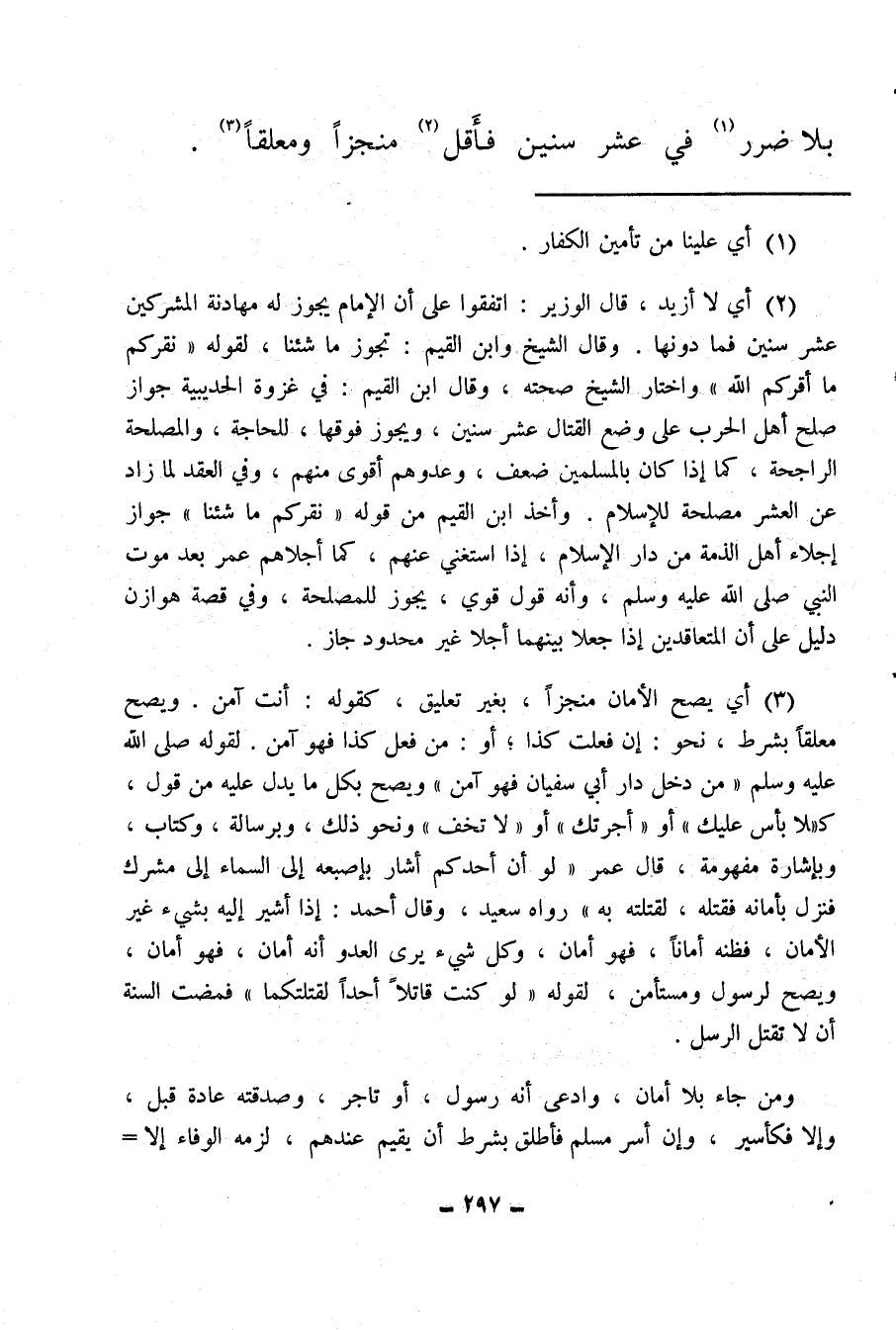 (¬2) أي لا أزيد، قال الوزير: اتفقوا على أن الإمام يجوز له مهادنة المشركين عشر سنين فما دونها، وقال الشيخ وابن القيم: تجوز ما شئنا لقوله: «نقركم ما أقركم الله» واختار الشيخ صحته، وقال ابن القيم: في غزوة الحديبية جواز صلح أهل الحرب على وضع القتال عشر سنين، ويجوز فوقها، للحاجة، والمصلحة الراجحة، كما إذا كان بالمسلمين ضعف، وعدوهم أقوى منهم، وفي العقد لما زاد عن العشر مصلحة للإسلام، وأخذ ابن القيم من قوله: «نقركم ما شئنا» جواز إجلاء أهل الذمة من دار الإسلام، إذا استغني عنهم، كما أجلاهم عمر بعد موت النبي صلى الله عليه وسلم وأنه قول قوي، يجوز للمصلحة، وفي قصة هوازن دليل على أن المتعاقدين إذا جعلا بينهما أجلا غير محدود جاز.