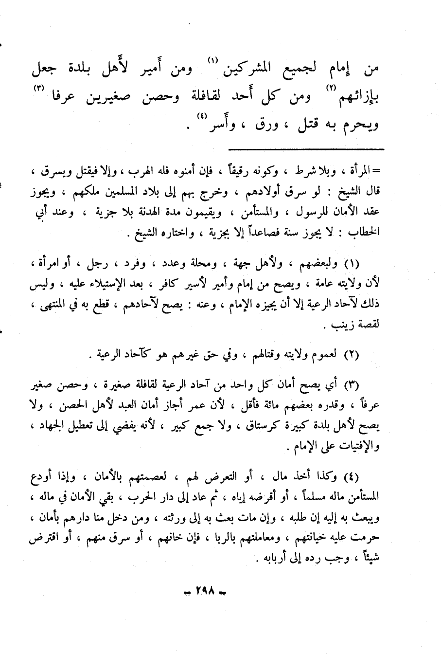 من إمام لجميع المشركين (¬1) ومن أمير لأهل بلدة جعل بإزائهم (¬2) ومن كل أحد لقافلة وحصن صغيرين عرفا (¬3) ويحرم به قتل، ورق، وأسر (¬4) .