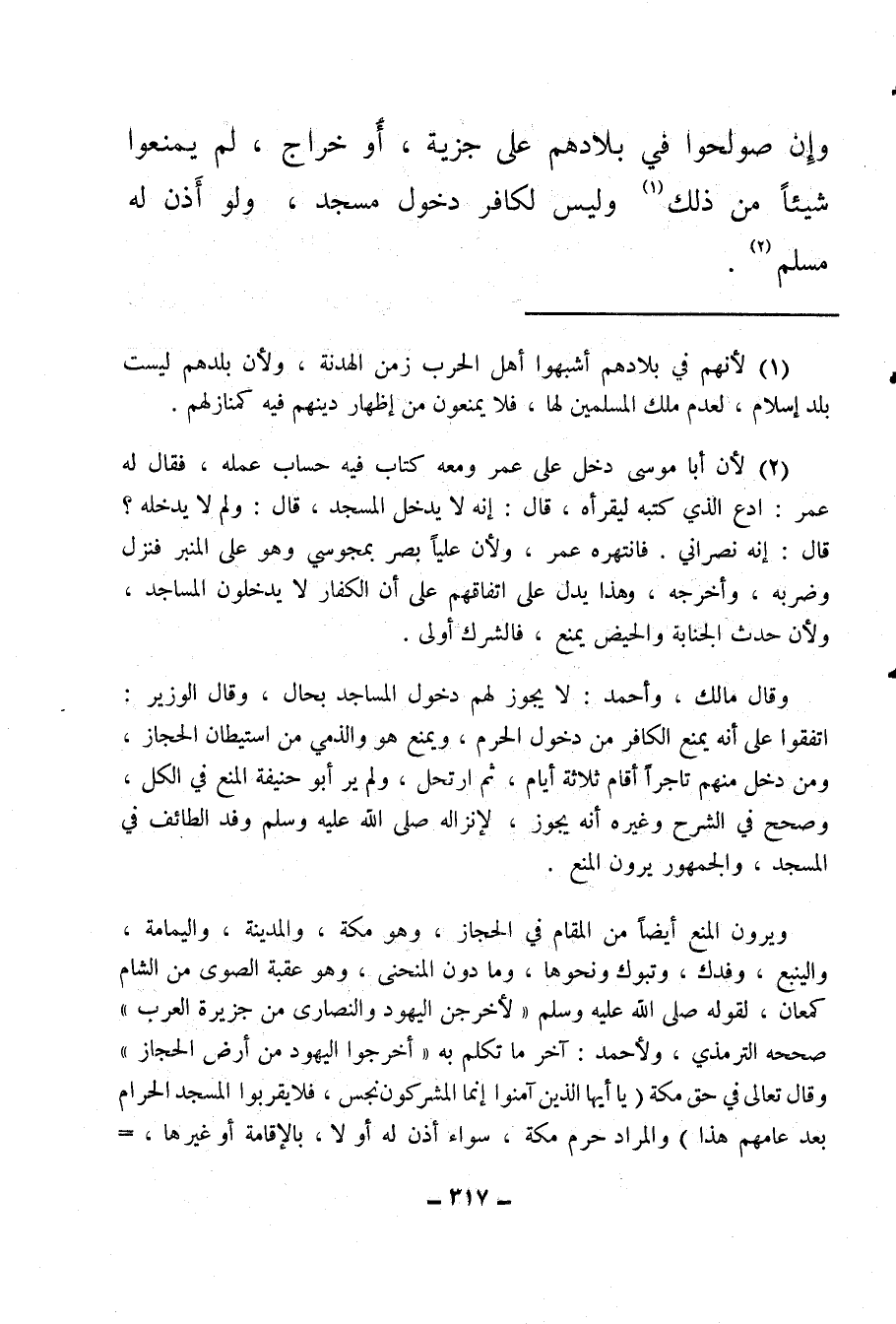 (¬2) لأن أبا موسى دخل على عمر ومعه كتاب فيه حساب عمله، فقال له عمر: ادع الذي كتبه ليقرأه، قال: إنه لا يدخل المسجد، قال: ولم لا يدخله؟ قال: إنه نصراني، فانتهره عمر، ولأن عليا بصر بمجوسي وهو على المنبر فنزل وضربه، وأخرجه، وهذا يدل على اتفاقهم على أن الكفار لا يدخلون المساجد، ولأن حدث الجنابة والحيض يمنع، فالشرك أولى.