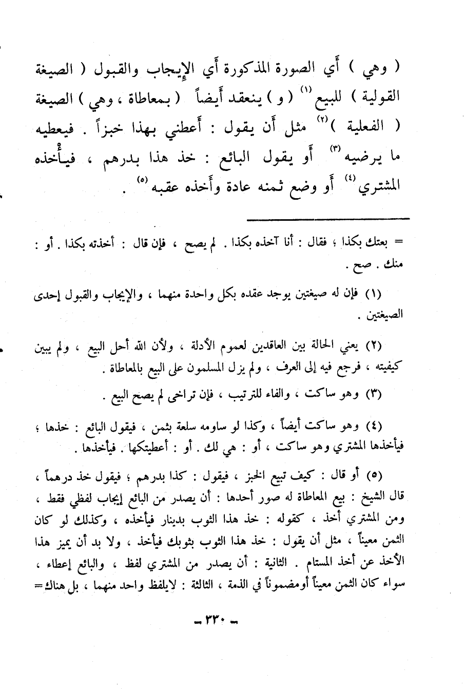 (¬5) أو قال: كيف تبيع الخبز، فيقول: كذا بدرهم، فيقول خذ درهمًا، قال الشيخ: بيع المعاطاة له صور أحدها: أن يصدر من البائع إيجاب لفظي فقط، ومن المشتري أخذ كقوله: خذ هذا الثوب بدينار فيأخذه، وكذلك لو كان الثمن معينًا، مثل أن يقول: خذ هذا الثوب بثوبك فيأخذ، ولا بد أن يميز هذا الأخذ عن أخذ المستام، الثانية: أن يصدر من المشتري لفظ، والبائع إعطاء سواء كان الثمن معينًا أو مضمونًا في الذمة، الثالثة: لا يلفظ واحد منهما، بل هناك