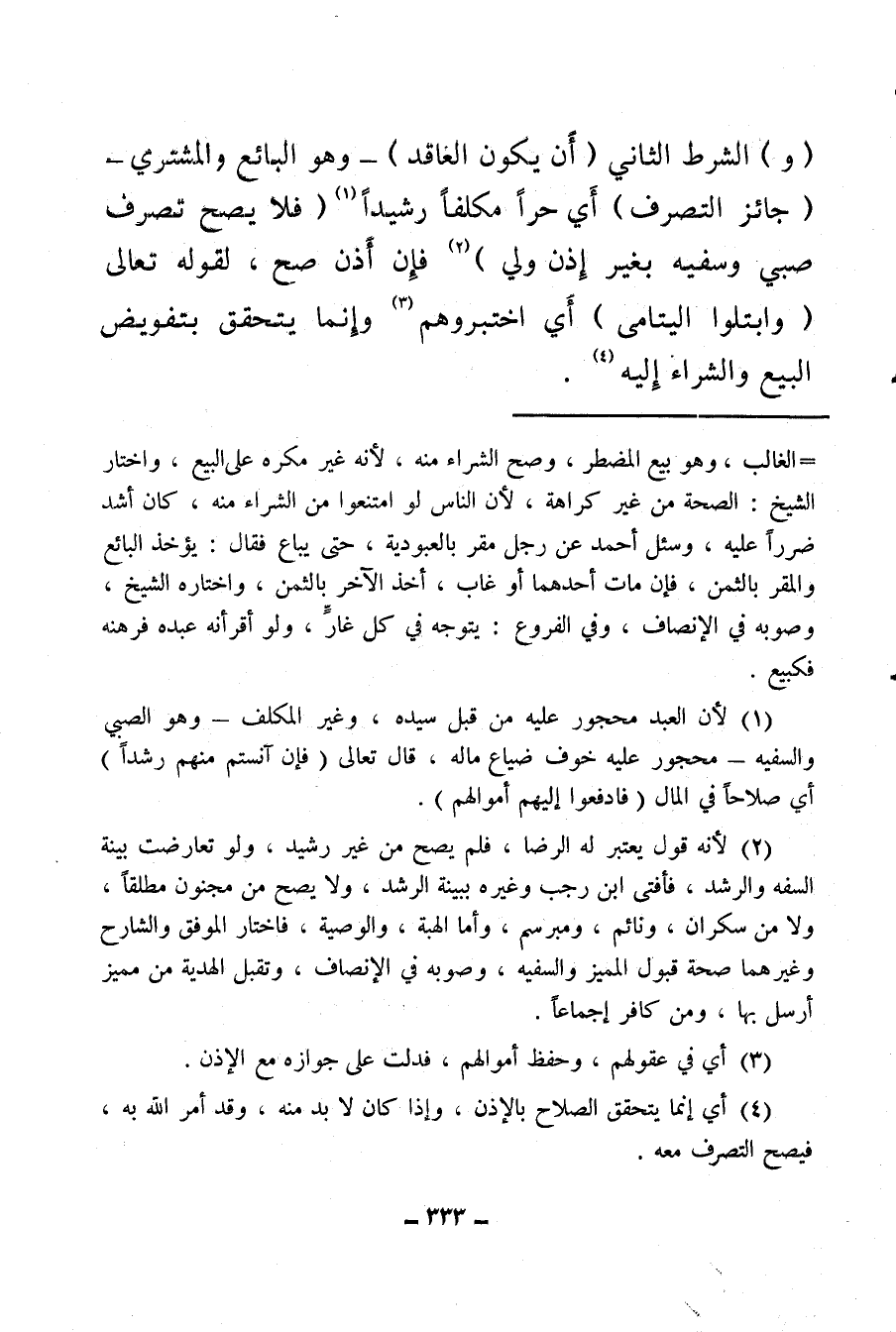 (¬1) لأن العبد محجور عليه من قبل سيده، وغير المكلف -وهو الصبي والسفيه- محجور عليه خوف ضياع ماله قال تعالى: {فَإِنْ آنَسْتُمْ مِنْهُمْ رُشْدًا} أي صلاحا في المال {فَادْفَعُوا إِلَيْهِمْ أَمْوَالَهُمْ} .
