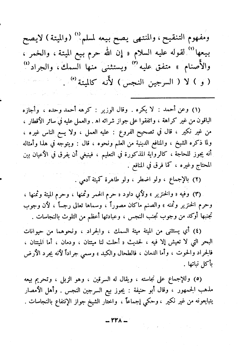 (¬5) وللإجماع على نجاسته، ويقال له السرقين، وهو الزبل، وتحريم بيعه مذهب الجمهور، وقال أبو حنيفة، ويجوز بيع السرجين والنجس، وأهل الأمصار يتبايعونه من غير نكير، وحكي إجماعًا، واختار الشيخ جواز الانتفاع بالنجاسات.