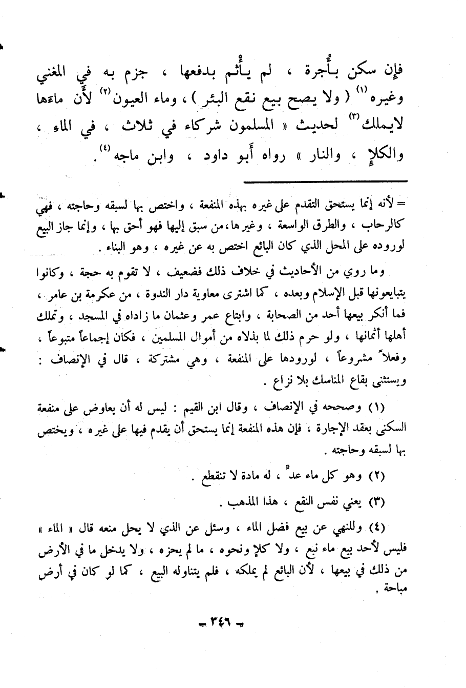 (¬4) وللنهي عن بيع فضل الماء، وسئل عن الذي لا يحل منعه قال: «الماء» فليس لأحد بيع ماء نبع، ولا كلأ ونحوه، ما لم يجزه، ولا يدخل ما في الأرض من ذلك في بيعها، لأن البائع لم يملكه، فلم يتناوله البيع، كما لو كان في أرض مباحة.