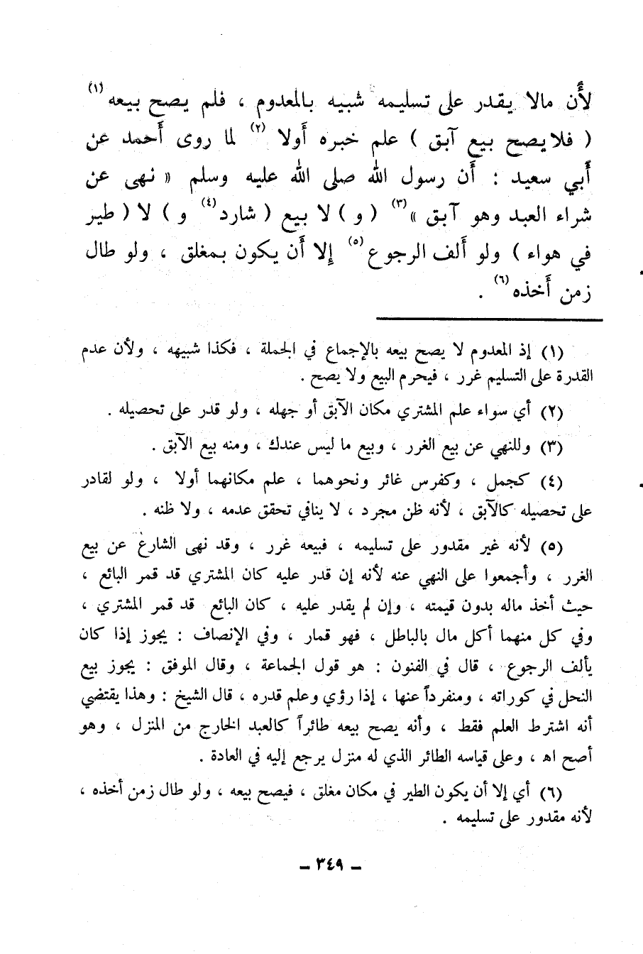 (¬5) لأنه غير مقدور على تسليمه، فبيعه غرر، وقد نهى الشارع عن بيع الغرر، وأجمعوا على النهي عنه لأنه إن قدر عليه كان المشتري قد قمر البائع، حيث أخذ ما له بدون قيمته، وإن لم يقدر عليه، كان البائع قد قمر المشتري، وفي كل منهما أكل مال بالباطل، فهو قمار، وفي الإنصاف: يجوز إذا كان يألف الرجوع، قال في الفنون: هو قول الجماعة، وقال الموفق: يجوز بيع النحل في كوراته، ومنفردًا عنها، إذا رئي وعلم قدره قال الشيخ: وهذا يقتضي أنه اشتراط العلم فقط، وأنه يصح بيعه طائرا كالعبد الخارج من المنزل، وهو أصح اهـ وعلى قياسه الطائر الذي له منزل يرجع إليه في العادة.