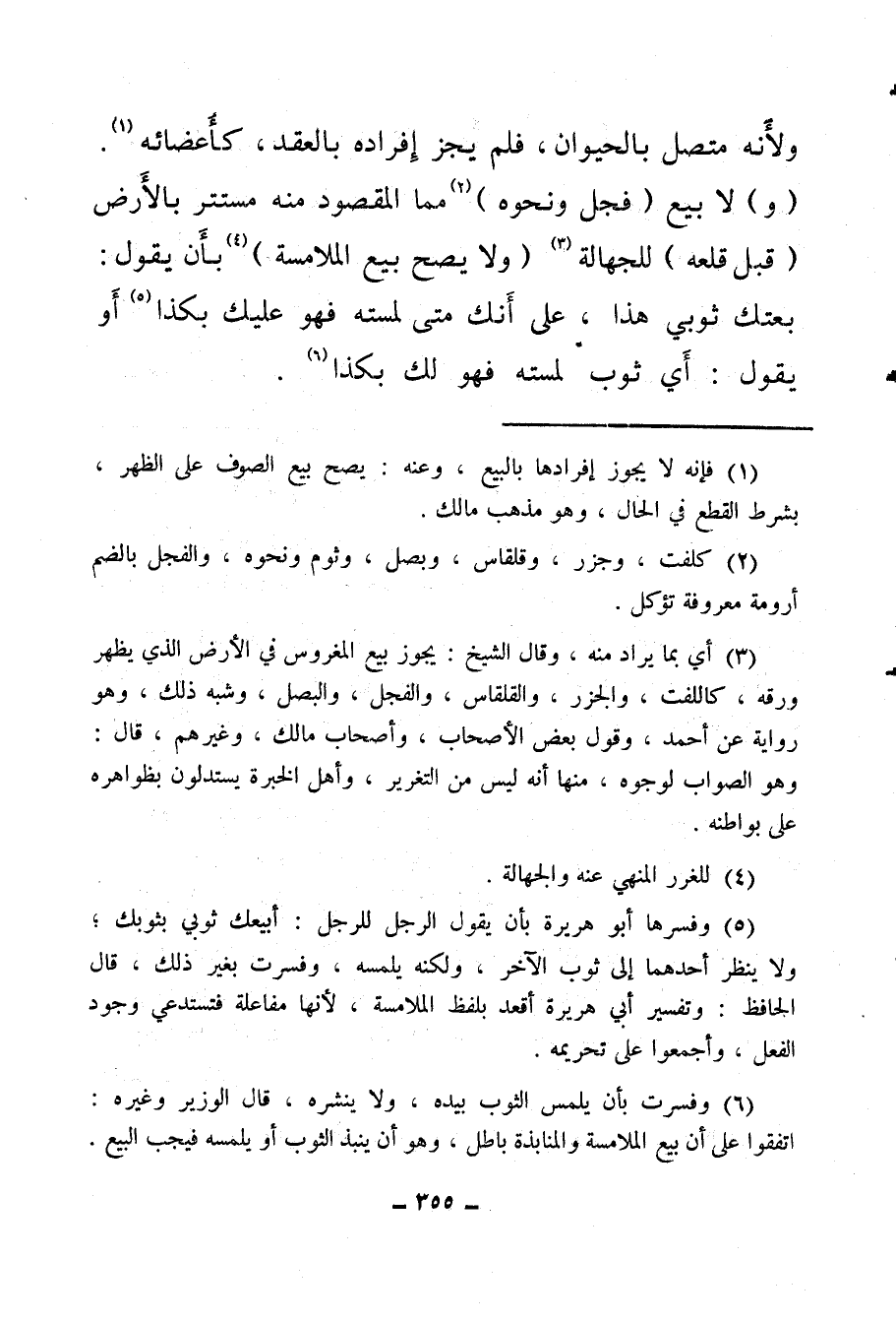 (¬5) وفسرها أبو هريرة بأن يقول الرجل للرجل: أبيعك ثوبي بثوبك، ولا ينظر أحدهما إلى ثوب الآخر، ولكنه يلمسه، وفسرت بغير ذلك قال الحافظ: وتفسير أبي هريرة أقعد بلفظ الملامسة، لأنها مفاعلة فتستدعي وجود الفعل، وأجمعوا على تحريمه.