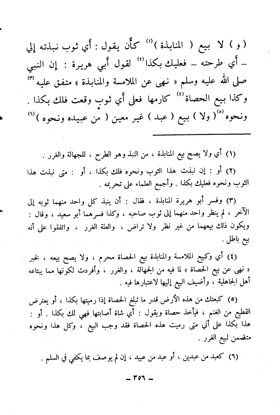 (¬5) كبعتك من هذه الأرض قدر ما تبلغ الحصاة إذا رميتها بكذا، أو يعترض القطيع من الغنم، فيأخذ حصاة ويقول: أي شاة أصابتها فهي لك بكذا، أو هذا بكذا على أني متى رميت هذه الحصاة فقد وجب البيع، وكل هذا ونحوه متضمن لبيع الغرر.