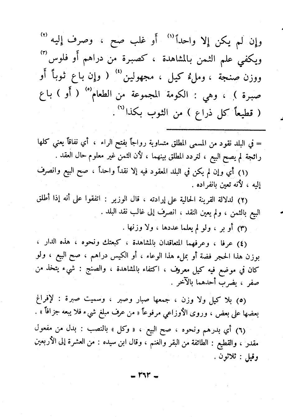 وإن لم يكن إلا واحدًا (¬1) أو غلب صح، وصرف إليه (¬2) ويكفي علم الثمن بالمشاهدة، كصبرة، من دراهم أو فلوس (¬3) ووزن صنجة، وملء كيل، مجهولين (¬4) (وإن باع ثوبا أو صبرة) وهي: الكومة المجموعة من الطعام (¬5) (أو) باع (قطيعا كل ذراع) من الثوب بكذا (¬6) .