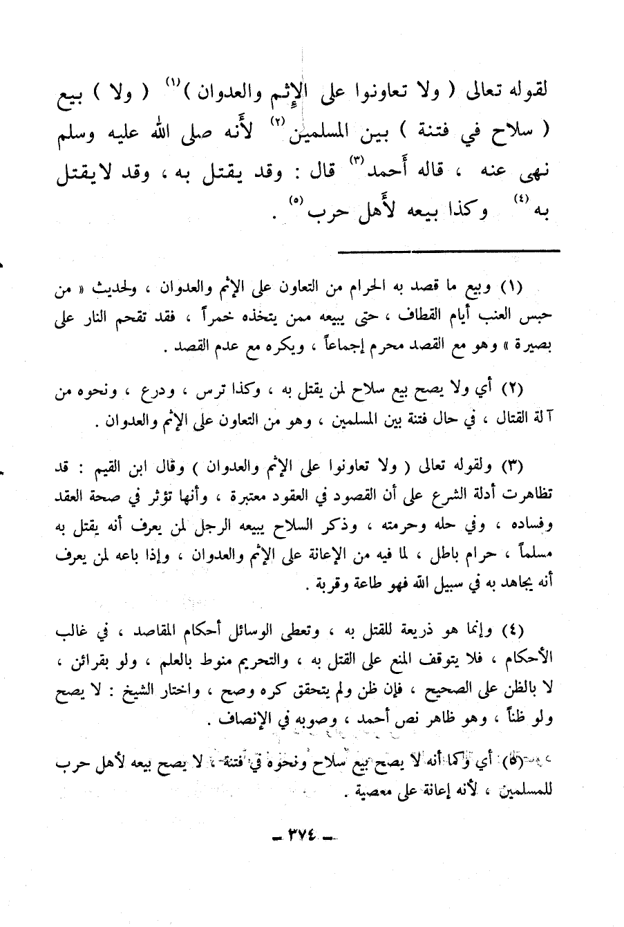 (¬3) ولقوله تعالى: {وَلا تَعَاوَنُوا عَلَى الإِثْمِ وَالْعُدْوَانِ} وقال ابن القيم: قد تظاهرت أدلة الشرع على أن القصود في العقود معتبرة، وأنها تؤثر في صحة العقد وفساده، وفي حله وحرمته، وذكر السلاح يبيعه الرجل لمن يعرف أنه يقتل به مسلما، حرام باطل، لما فيه من الإعانة على الإثم والعدوان، وإذا باعه لمن يعرف أنه يجاهد به في سبيل الله فهو طاعة وقربة.