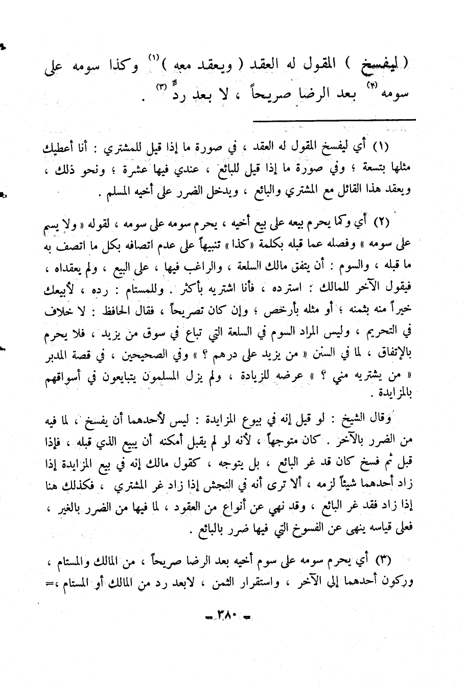 وقال الشيخ: لو قيل إنه في بيوع المزايدة: ليس لأحدهما أن يفسخ، لما فيه من الضرر بالآخر، كان متوجهًا، لأنه لو لم يقبل أمكنه أن يبيع الذي قبله، فإذا قبل ثم فسخ كان قد غر البائع، بل يتوجه، كقول مالك إنه في بيع المزايدة إذا زاد أحدهما شيئا لزمه، ألا ترى أنه في النجش إذا زاد غر المشتري، فكذلك هنا إذا زاد فقد غر البائع، وقد نهي عن أنواع من العقود، لما فيها من الضرر بالغير، فعلى قياسه ينهى عن الفسوخ التي فيها ضرر للبائع.