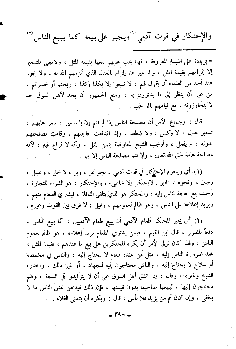 (¬2) أي يجبر المحتكر طعام الآدمي أن يبيع طعام الآدميين، كما يبيع الناس، دفعا للضرر، قال ابن القيم: فيمن يشتري الطعام يريد إغلاءه، هو ظالم لعموم الناس، ولهذا كان لولي الأمر أن يكره المحتكرين على بيع ما عندهم، بقيمة المثل، عند ضرورة الناس إليه، مثل من عنده طعام لا يحتاج إليه، والناس في مخمصة أو سلاح لا يحتاج إليه، والناس محتاجون إليه للجهاد، أو غير ذلك، واختاره الشيخ وغيره، وقال: إذا اتفق أهل السوق على أن لا يتزايدوا في السلعة، وهم محتاجون إليها، ليبيعها صاحبها بدون قيمتها، فإن ذلك فيه من غش الناس ما لا يخفي، وإن كان ثم من يزيد فلا بأس، قال: ويكره أن يتمنى الغلاء.