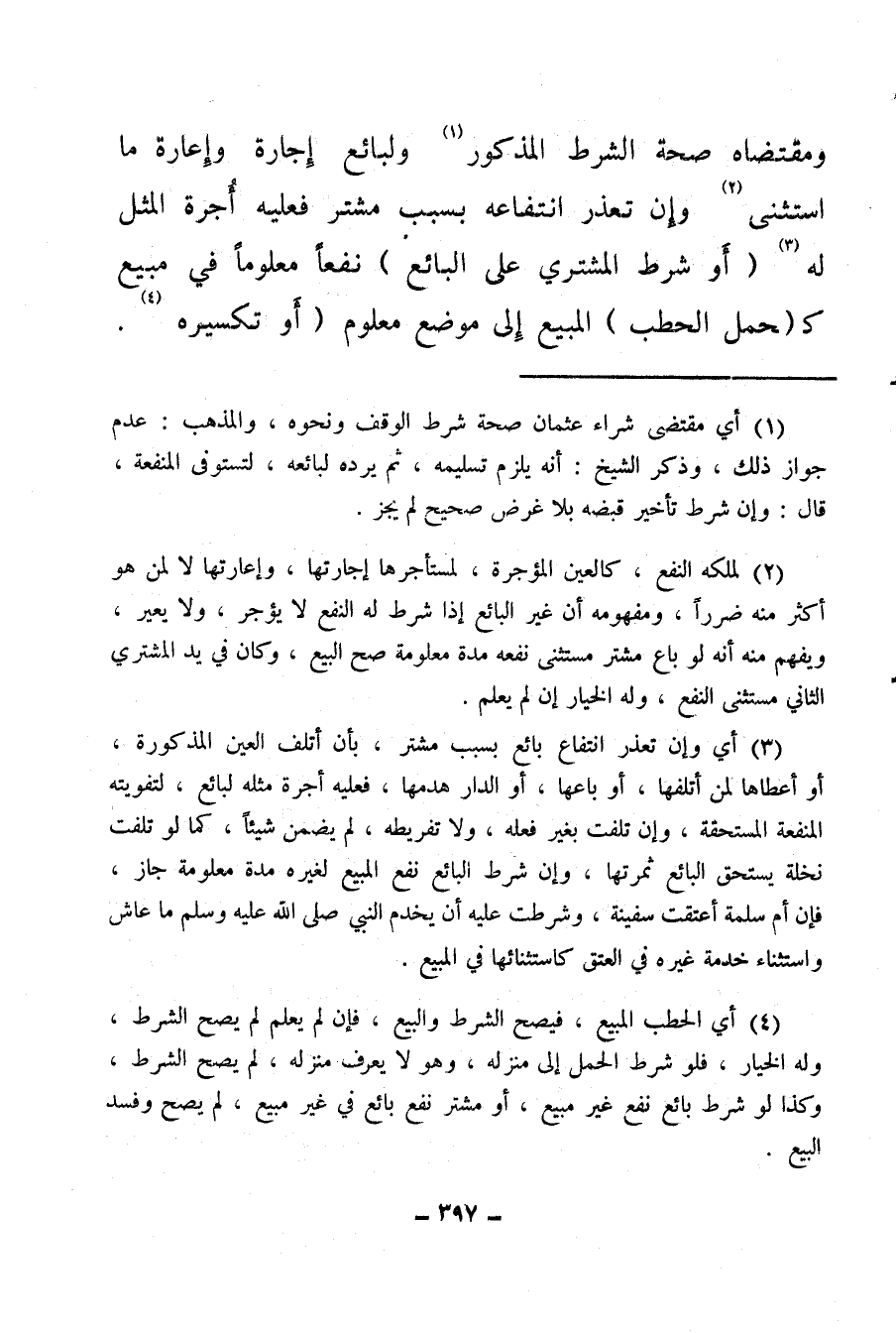ومقتضاه صحة الشرط المذكور (¬1) ولبائع إجارة وإعارة ما استثنى (¬2) وإن تعذر انتفاعه بسبب مشتر فعليه أجرة المثل له (¬3) (أو شرط المشتري على البائع) نفعا معلوما في مبيع كـ (حمل الحطب) المبيع إلى موضع معلوم (أو تكسيره (¬4)