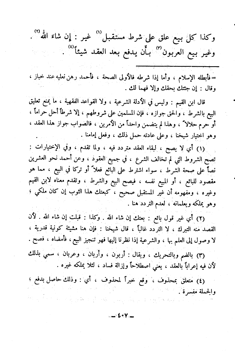 (¬1) أي لا يصح، لبقاء العقد متردد فيه، ولما تقدم، وفي الاختيارات: تصح الشروط التي لم تخالف الشرع، في جميع العقود، وعن أحمد نحو العشرين نصا على صحة الشرط، سواء اشترط على البائع فعلا أو تركا في البيع، مما هو مقصود للبائع، أو المبيع نفسه، فيصح البيع والشرط، وتقدم معناه لابن القيم وغيره، ومفهومه أن غير المستقبل صحيح، كبعتك هذا الثوب إن كان ملكي؛ وهو يملكه ويعلمانه لعدم التردد ها.