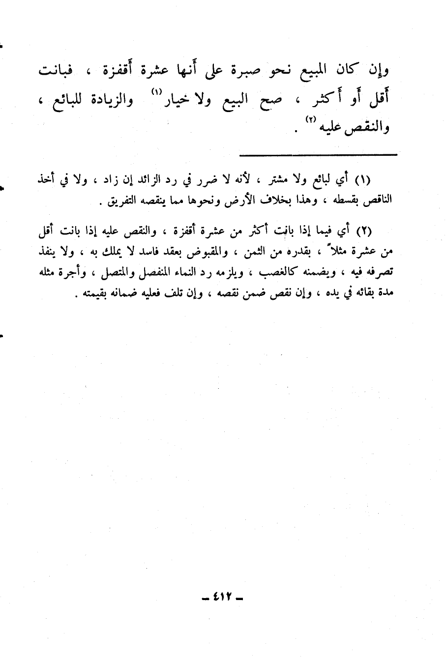 (¬2) أي فيما إذا بانت أكثر من عشرة أقفزة، والنقص عليه إذا بانت أقل من عشرة مثلا، بقدره من الثمن، والمقبوض بعقد فاسد لا يملك به، ولا ينفذ تصرفه فيه، ويضمنه كالغصب، ويلزمه رد النماء المنفصل والمتصل، وأجرة مثله مدة بقائه في يده، وإن نقص ضمن نقصه، وإن تلف فعليه ضمانه بقيمته.